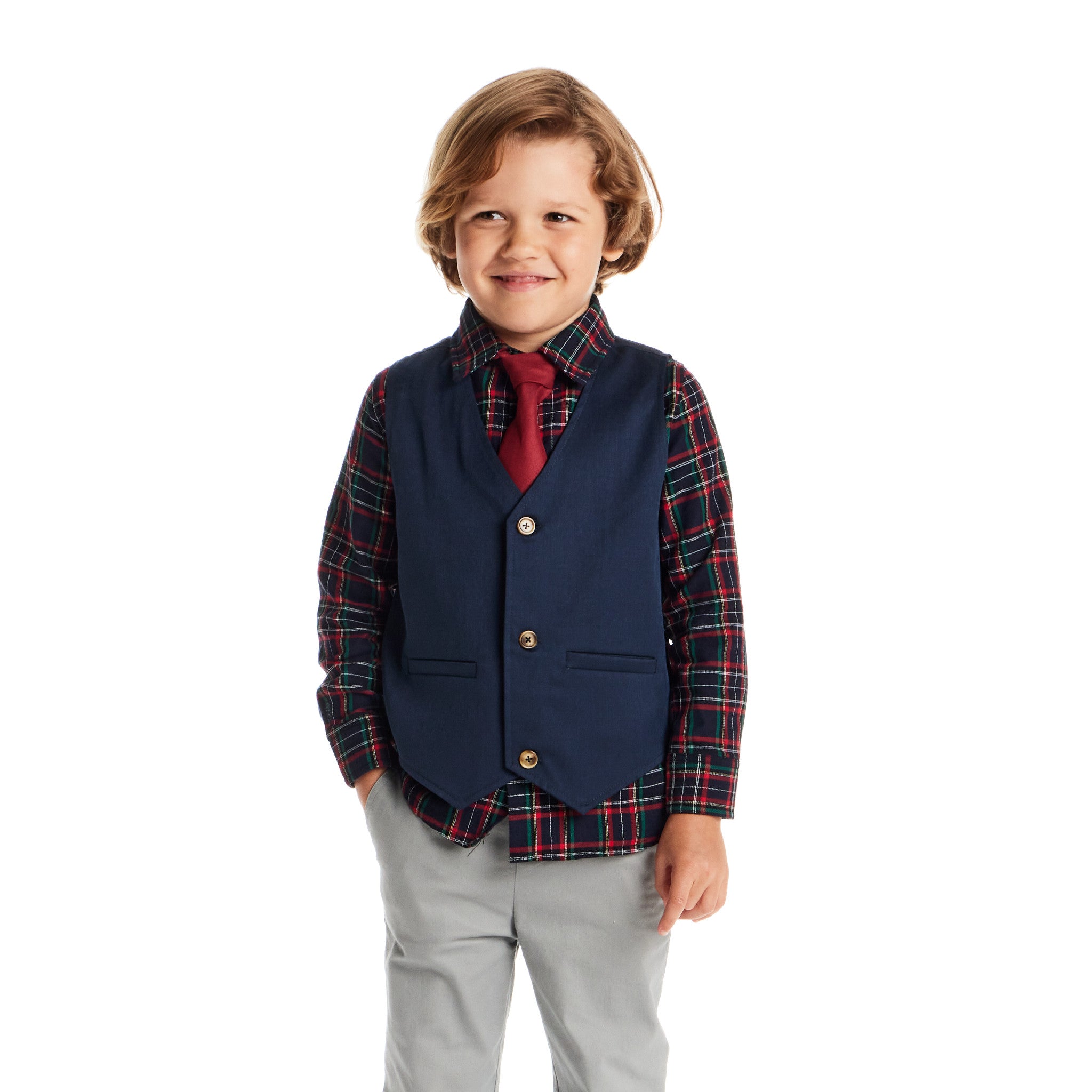 Little gentleman, big style! This 4-piece set makes dressing up a breeze with everything he needs to look picture-perfect: a festive plaid buttondown, sleek navy vest, soft gray twill pants, and a playful red self-fastening tie to top it all off. Whether it’s for holiday celebrations, family photos, or special occasions, this outfit brings the charm with none of the fuss.