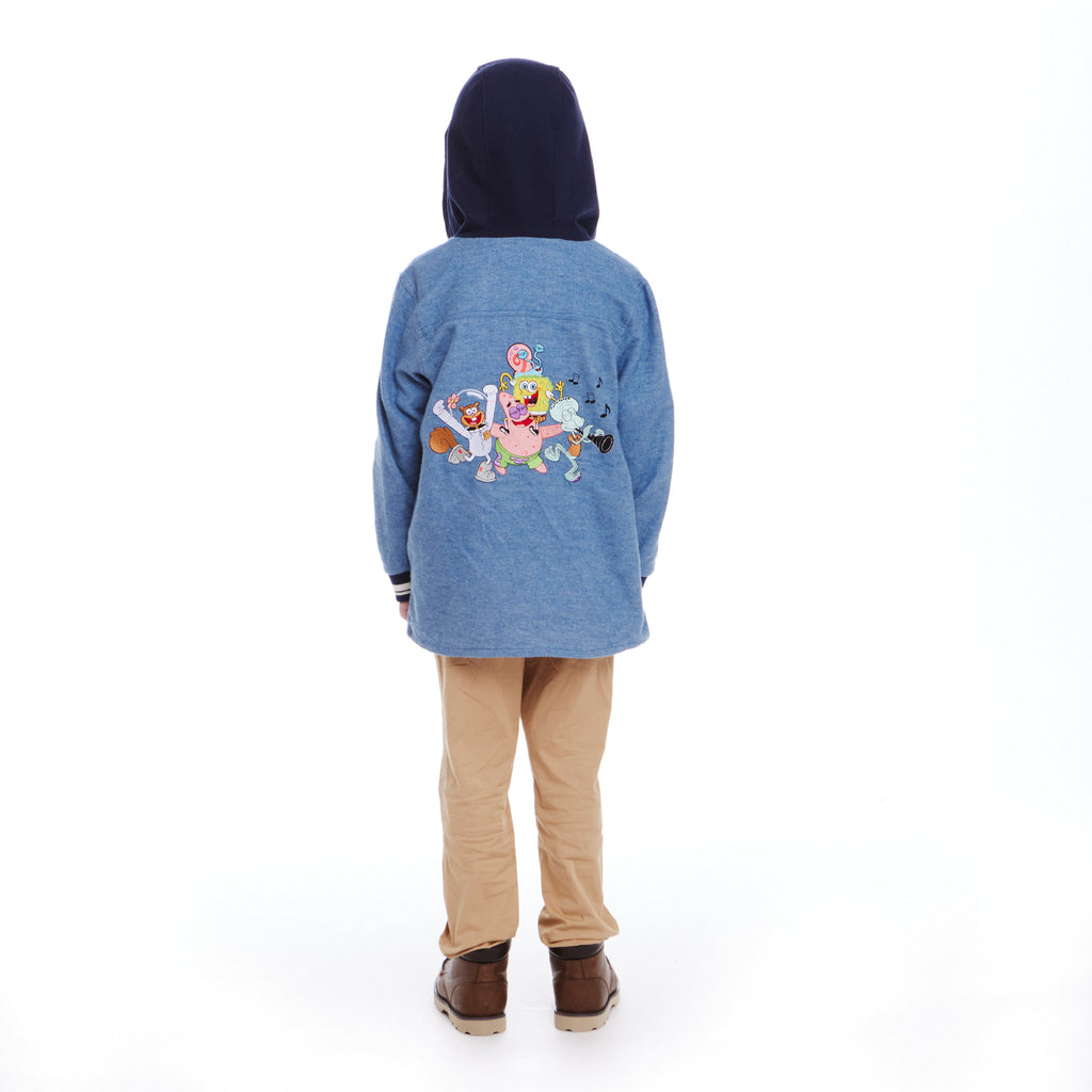 Embrace the playful spirit of SpongeBob SquarePants and his friends with this unique hooded shacket. Made from brushed washed oxford fabric, it features detailed embroidery of SpongeBob characters having a blast. The comfortable hoodie design and versatile styling make it ideal for layering during cooler months.