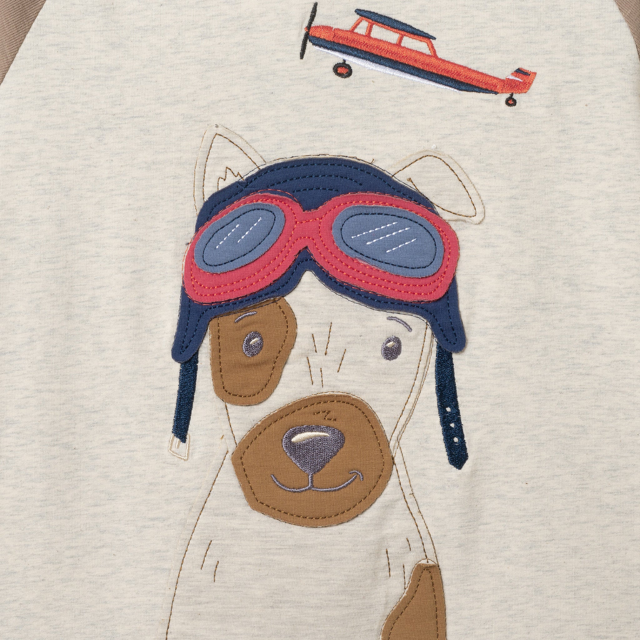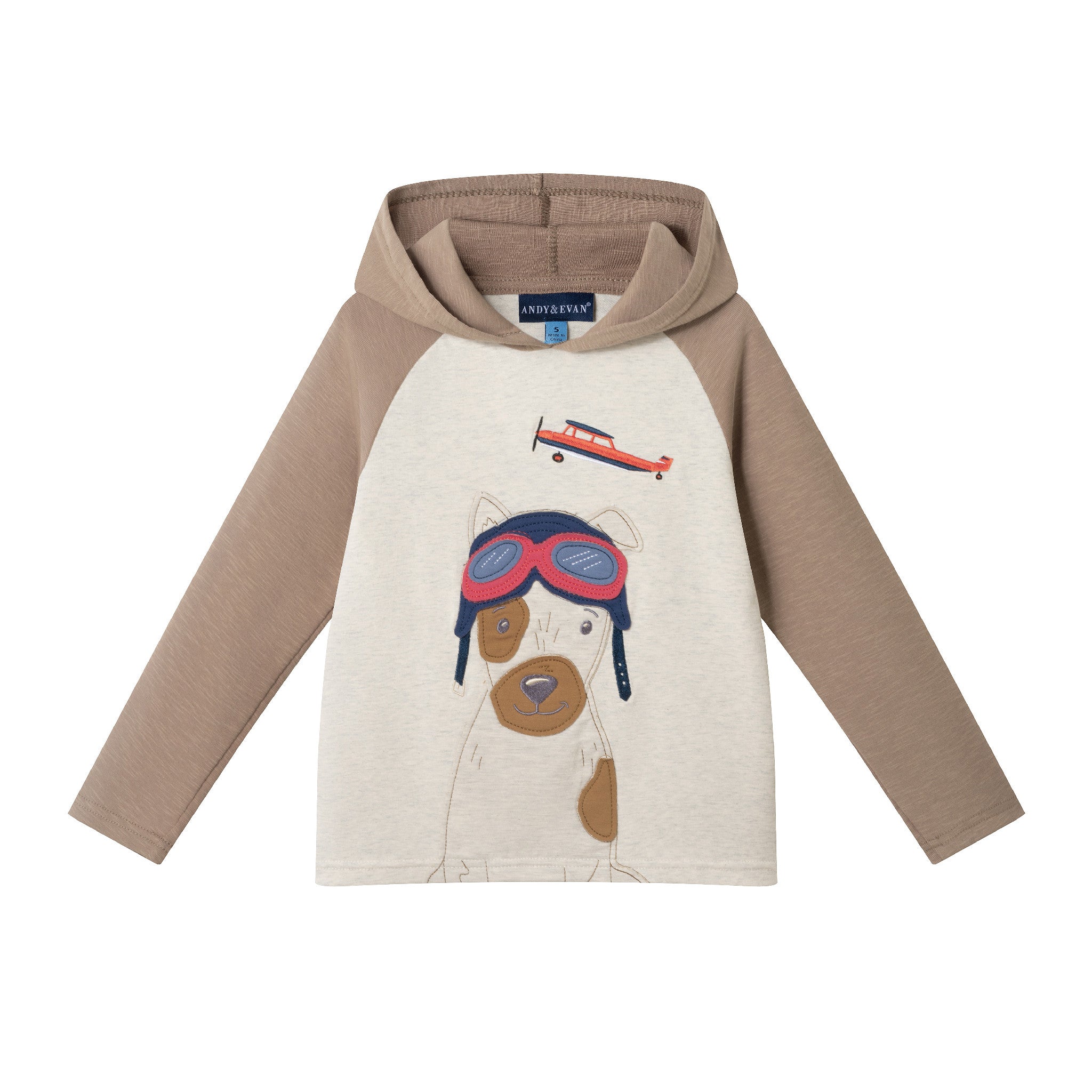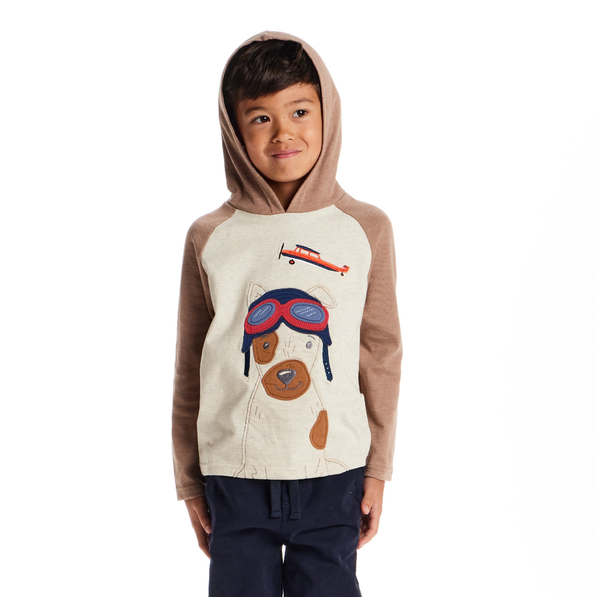 Fuel their imagination with this comfy hooded long sleeve tee featuring an adventurous dog pilot graphic with embroidered and applique details. Made with soft jersey fabric and contrast raglan sleeves, it's perfect for school days or weekend play.
