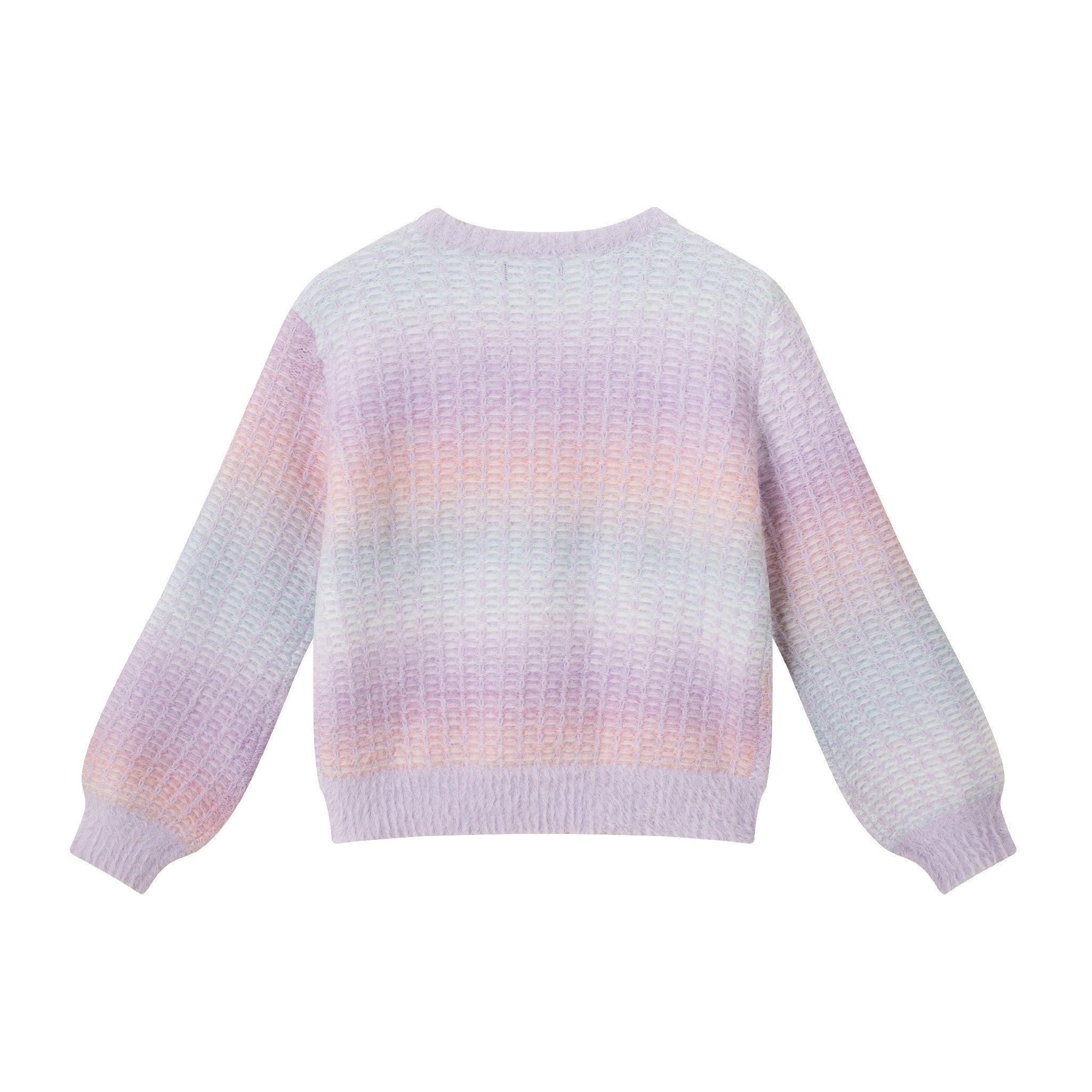 Soft, sweet, and full of cozy color! This fuzzy knit sweater features a dreamy ombré gradient in shades of lavender, blush, mint, and peach. With its plush texture and subtle waffle-like pattern, it’s the perfect piece for keeping warm while easily mixing and matching with solid bottoms.