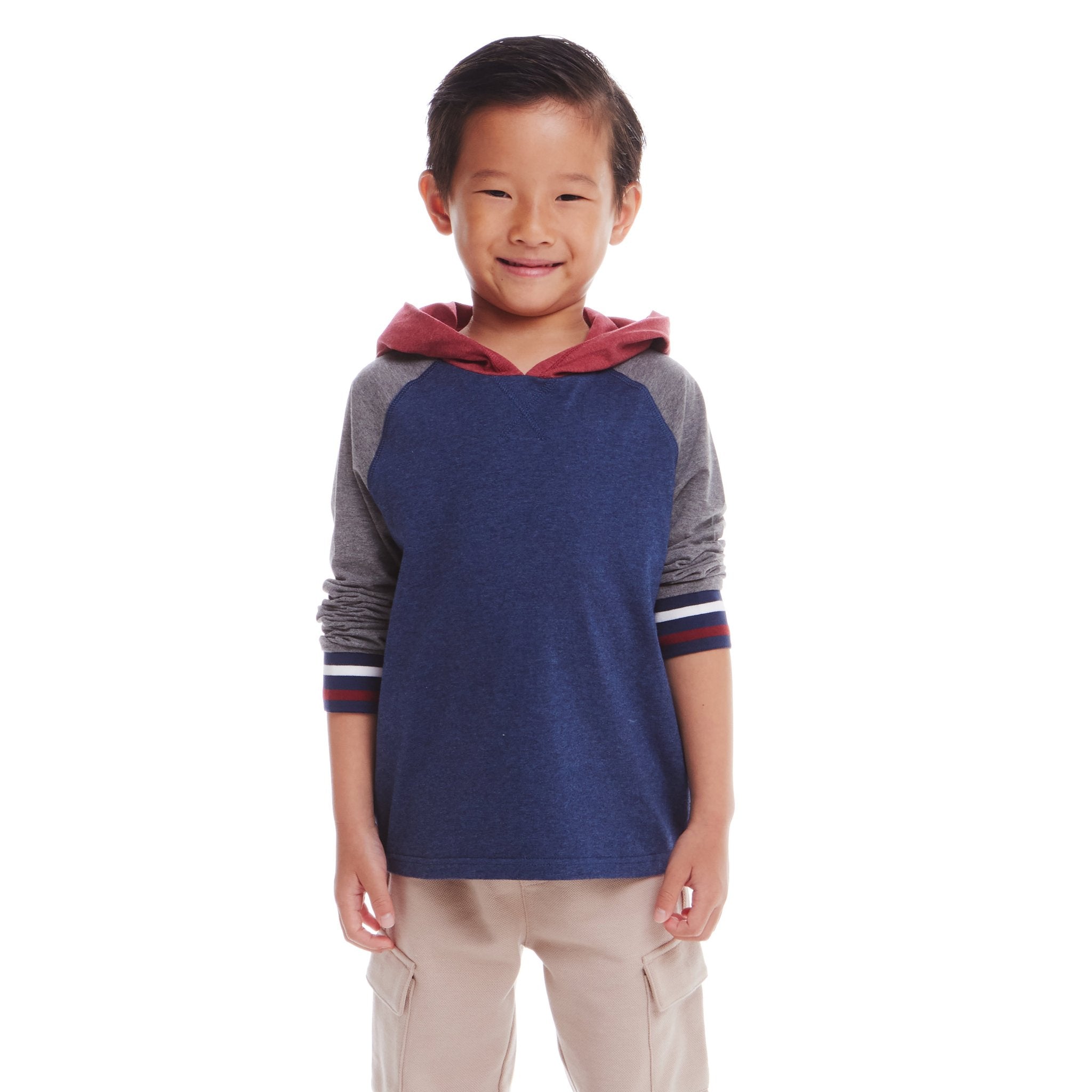 Keep your child stylish and cozy with this Red/Navy/Heather Grey Jersey Hooded Tee from Andy & Evan. The color-blocked design combines red, navy, and heather grey for a bold, sporty look. Made from soft jersey fabric, it offers both comfort and durability.
