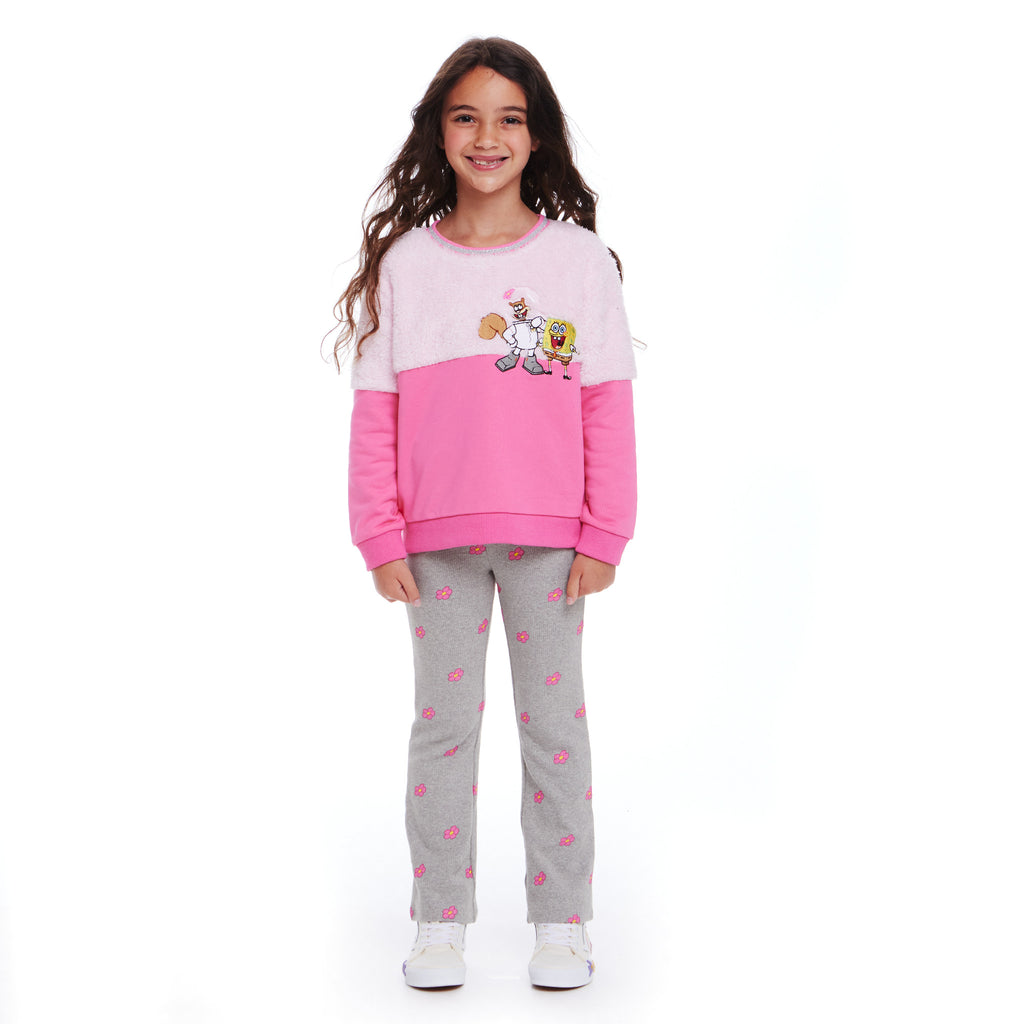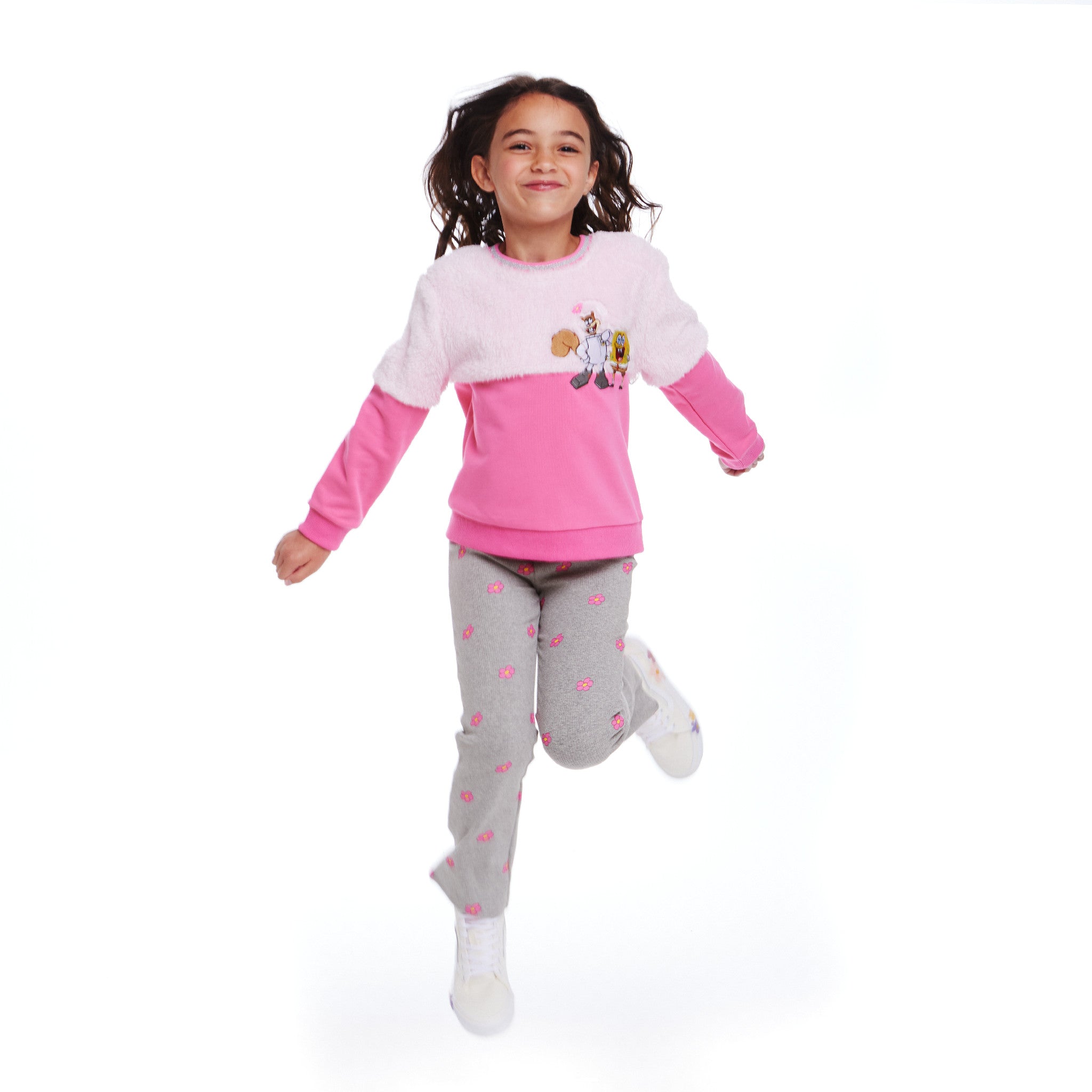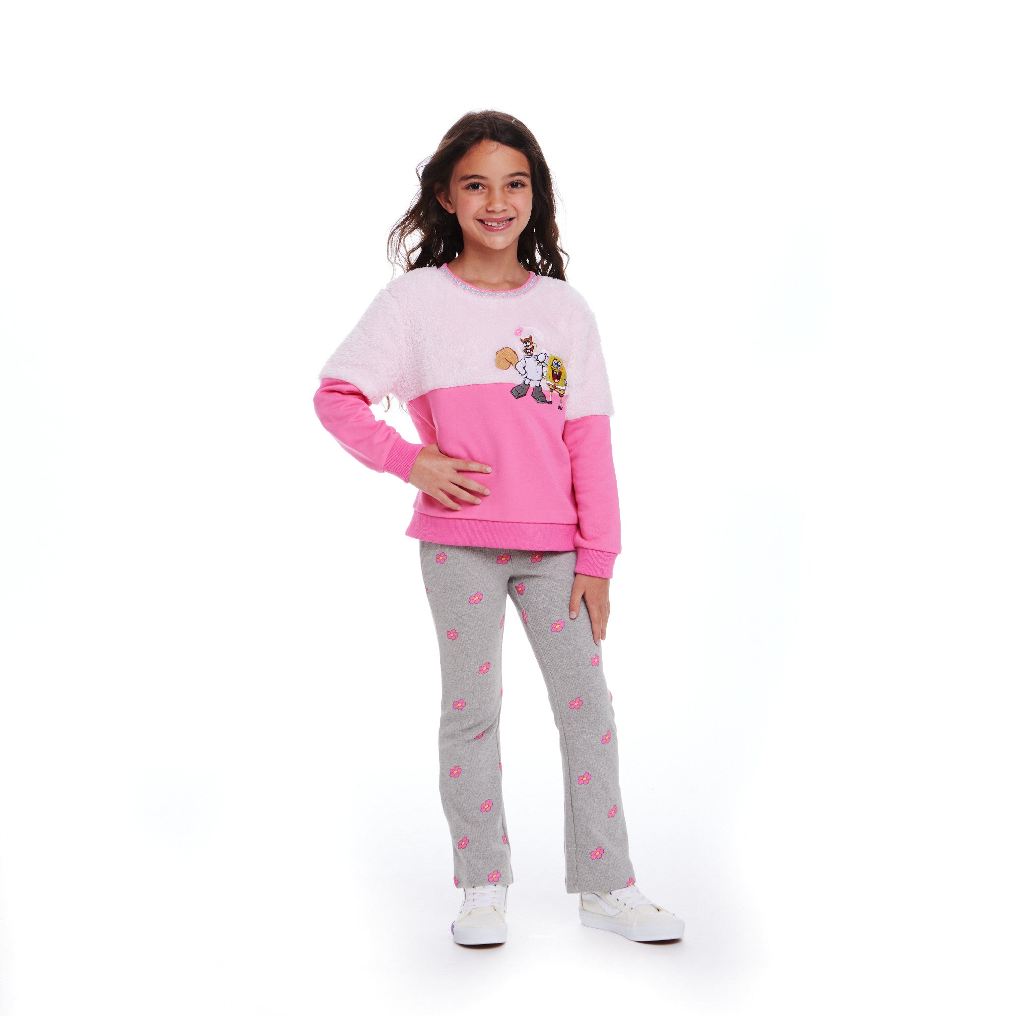 Dive into comfort and style with the SpongeBob SquarePants™ x Andy & Evan® Sweater & Ribbed Flare Legging Set. This adorable outfit features a cozy sherpa and French terry top adorned with a charming embroidery patch of SpongeBob and Sandy. Ribbed neck, cuffs, and hem ensure a snug fit, while the coordinating leggings boast a playful floral pattern and an elastic waist for easy wear. Perfect for playdates, family outings, or lounging at home, this set combines whimsy and practicality for any young SpongeBob fan.