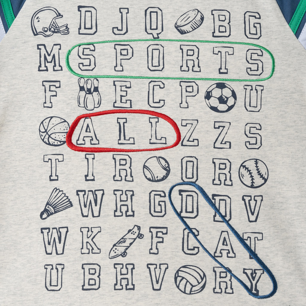 This long-sleeve tee is made for active days and all-day comfort, with soft raglan sleeves, bold varsity stripes, and an easy, relaxed fit. And just when you think it’s your everyday sporty top—surprise! A playful word-search graphic on the front spells out their mantra: SPORTS ALL DAY.