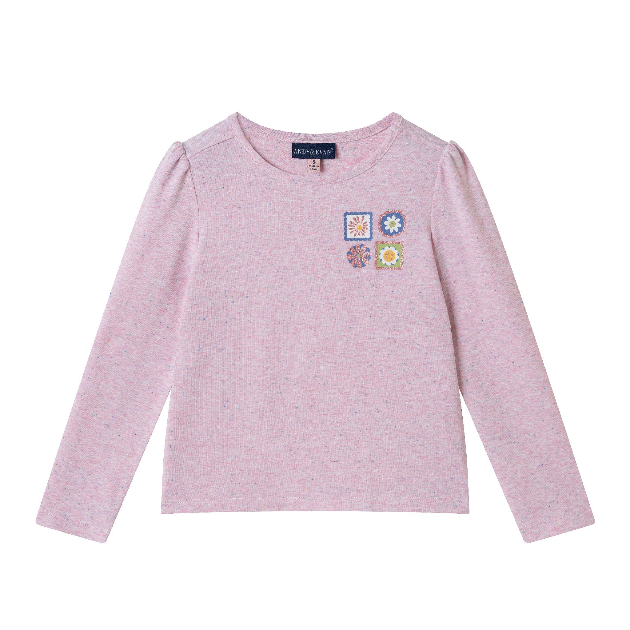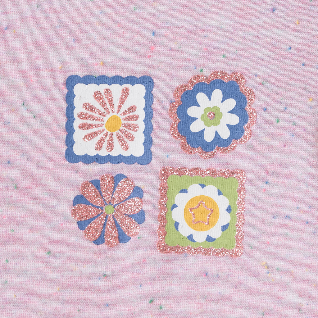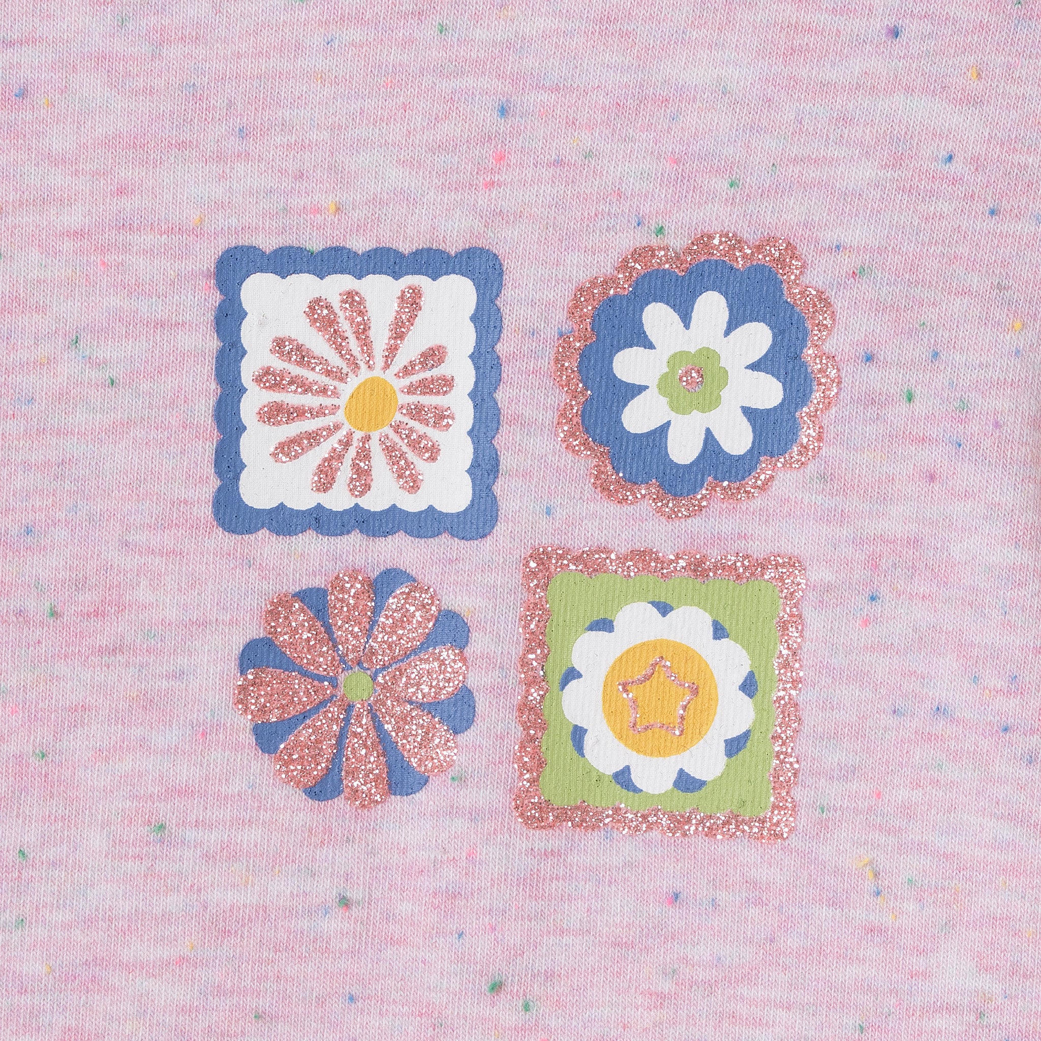 Add a little sparkle to her everyday with this soft and playful long sleeve tee! Featuring a charming arrangement of glittery flower graphics and a cheerful pink speckled fabric, this top brings good vibes and comfy style to any outfit.