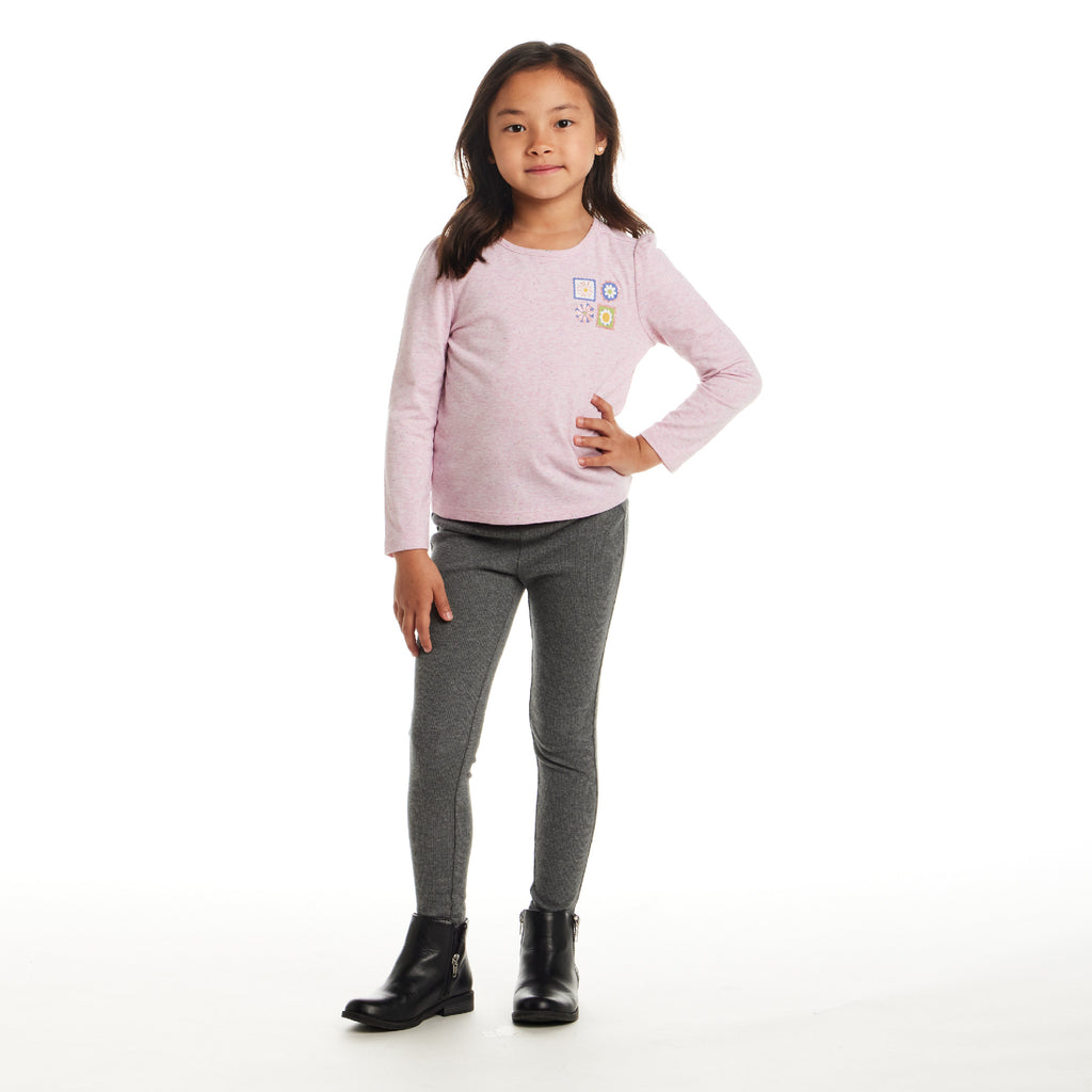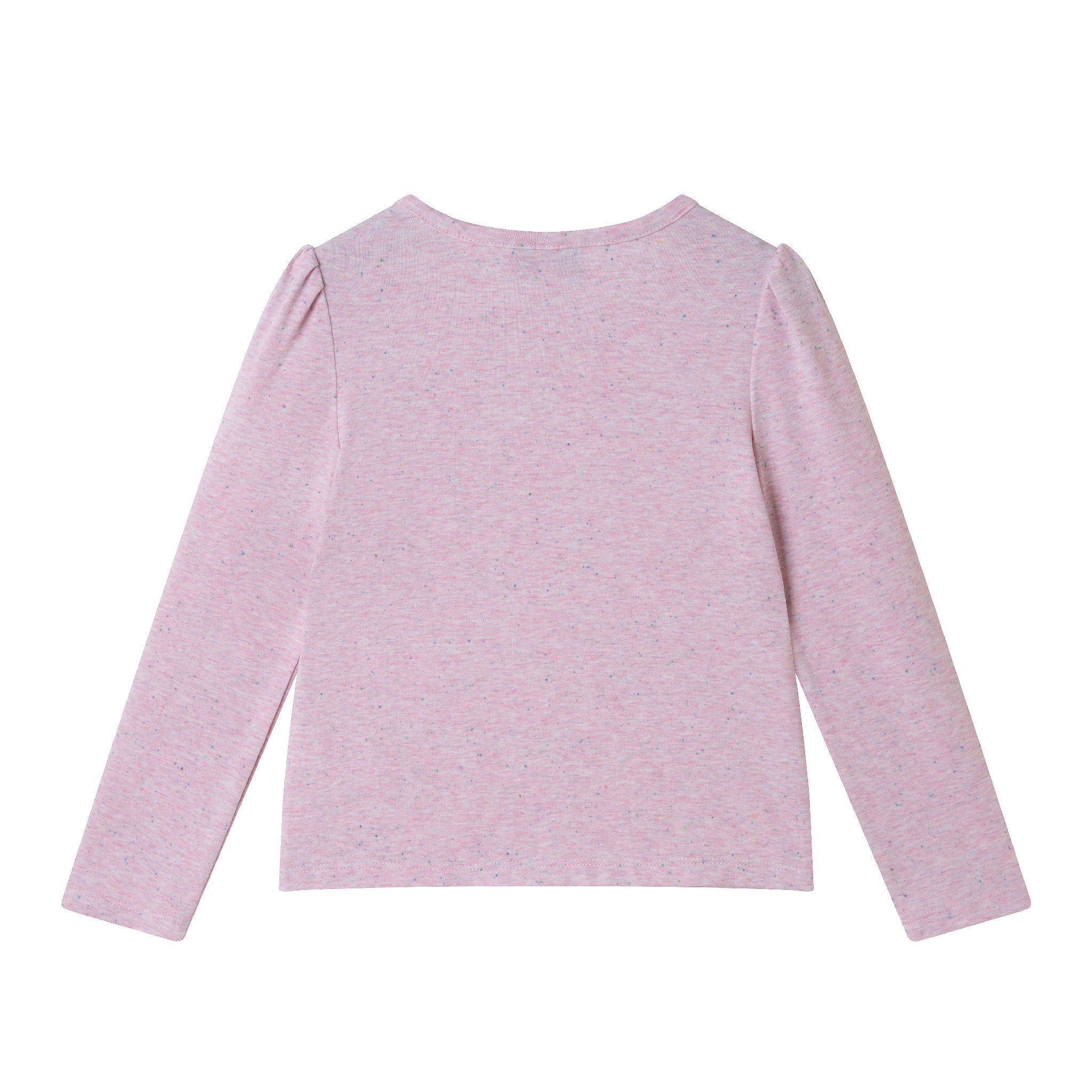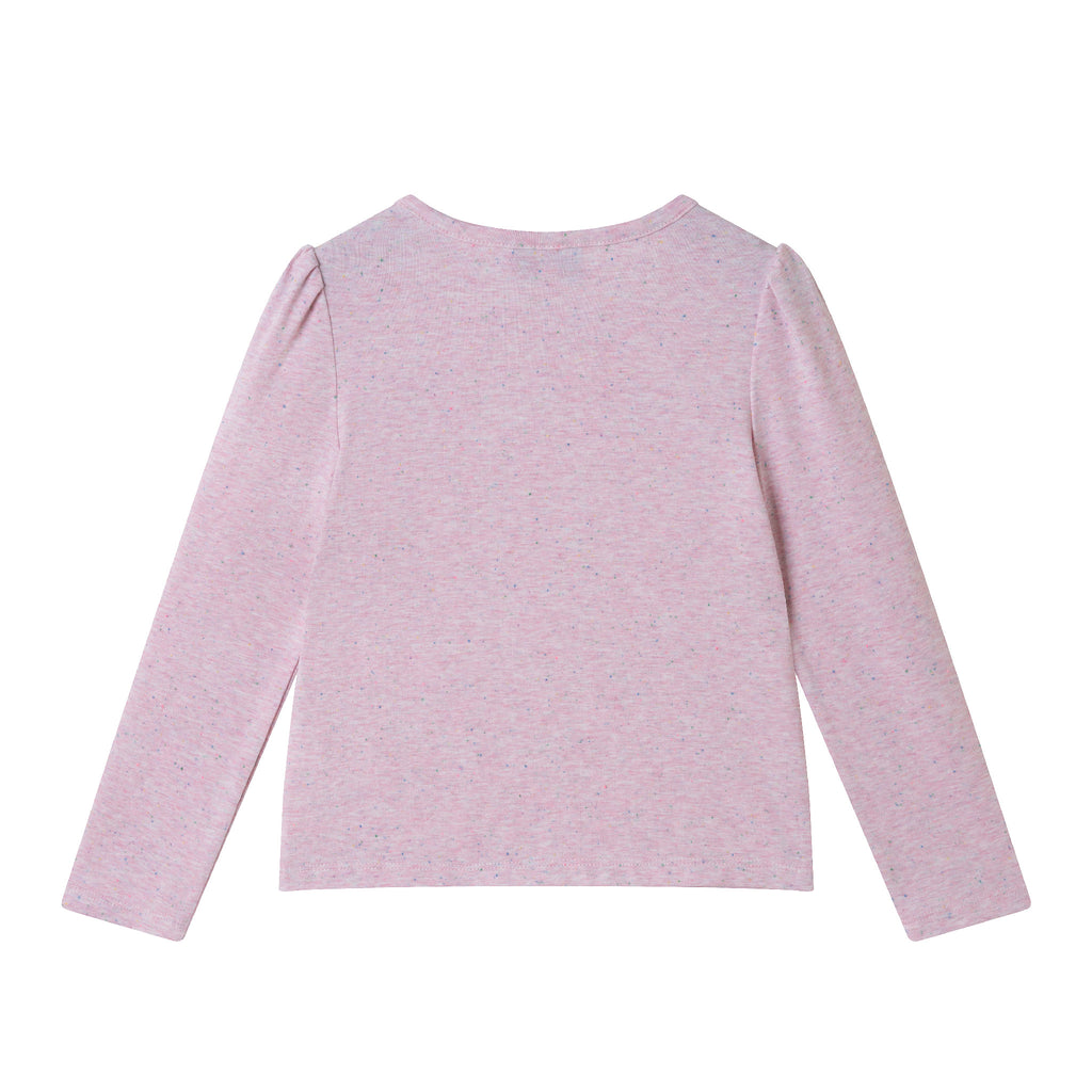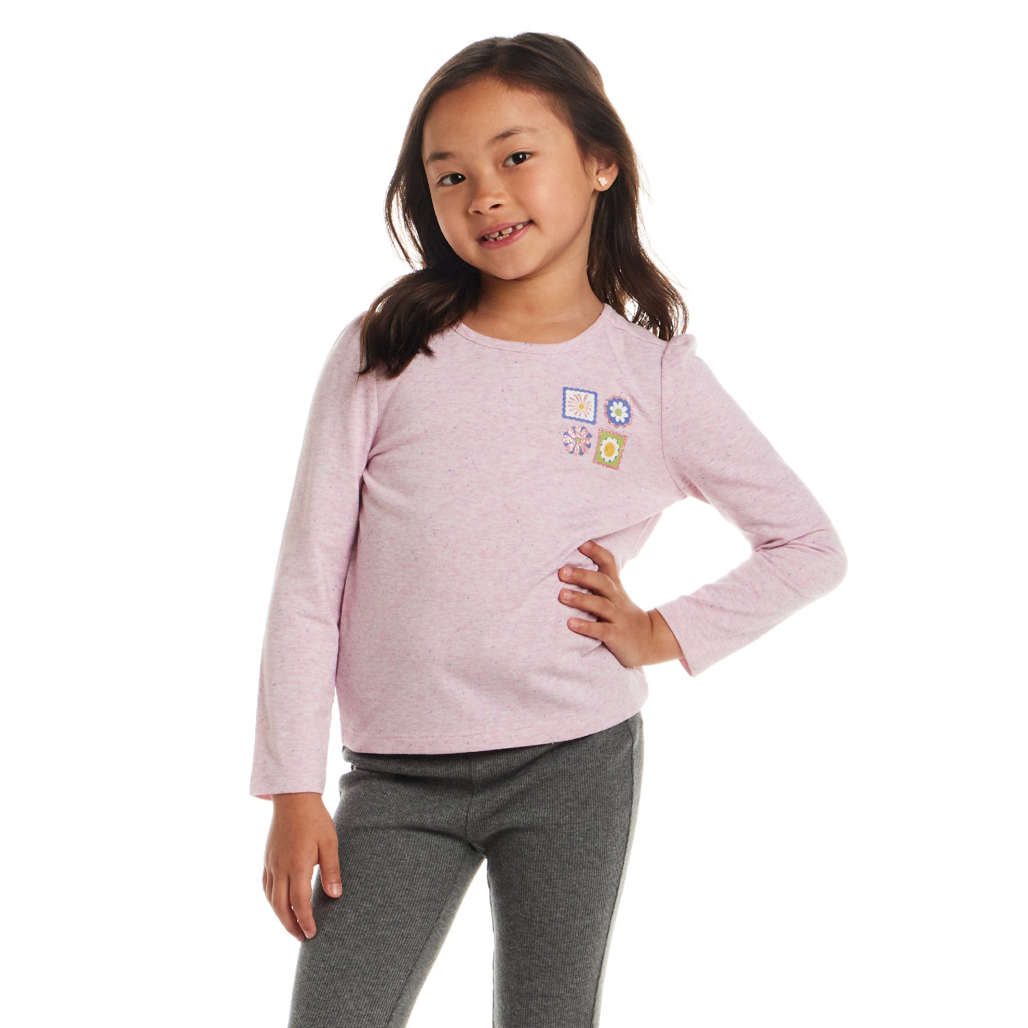 Add a little sparkle to her everyday with this soft and playful long sleeve tee! Featuring a charming arrangement of glittery flower graphics and a cheerful pink speckled fabric, this top brings good vibes and comfy style to any outfit.