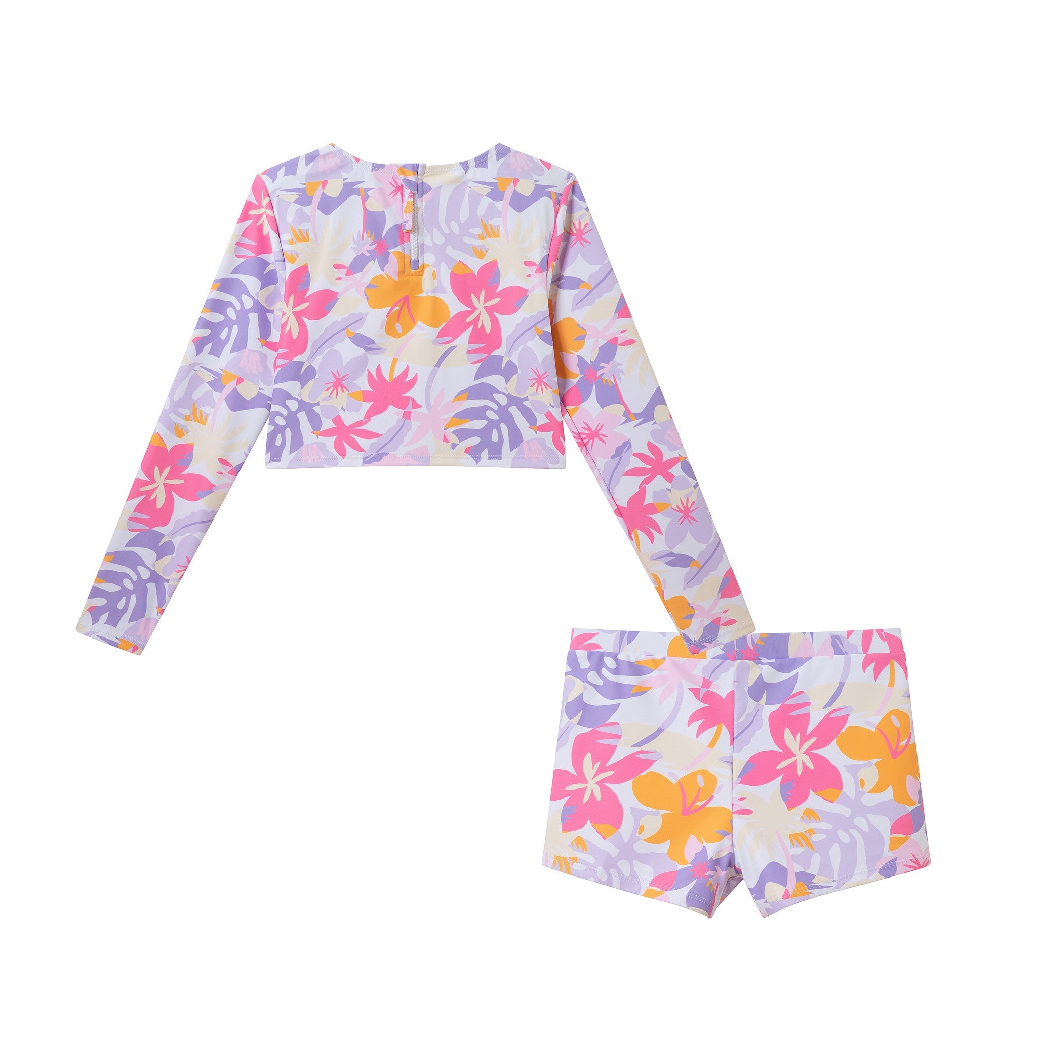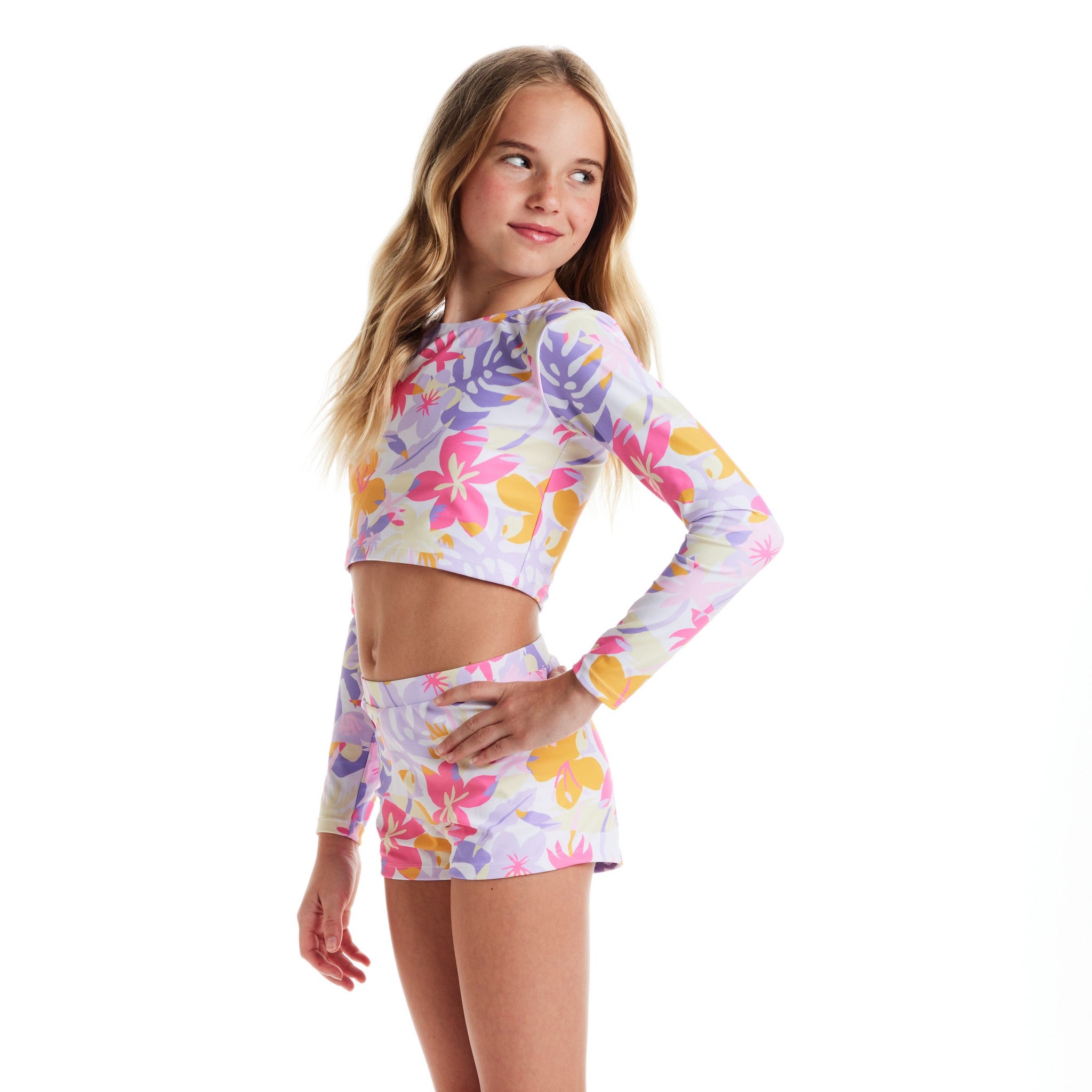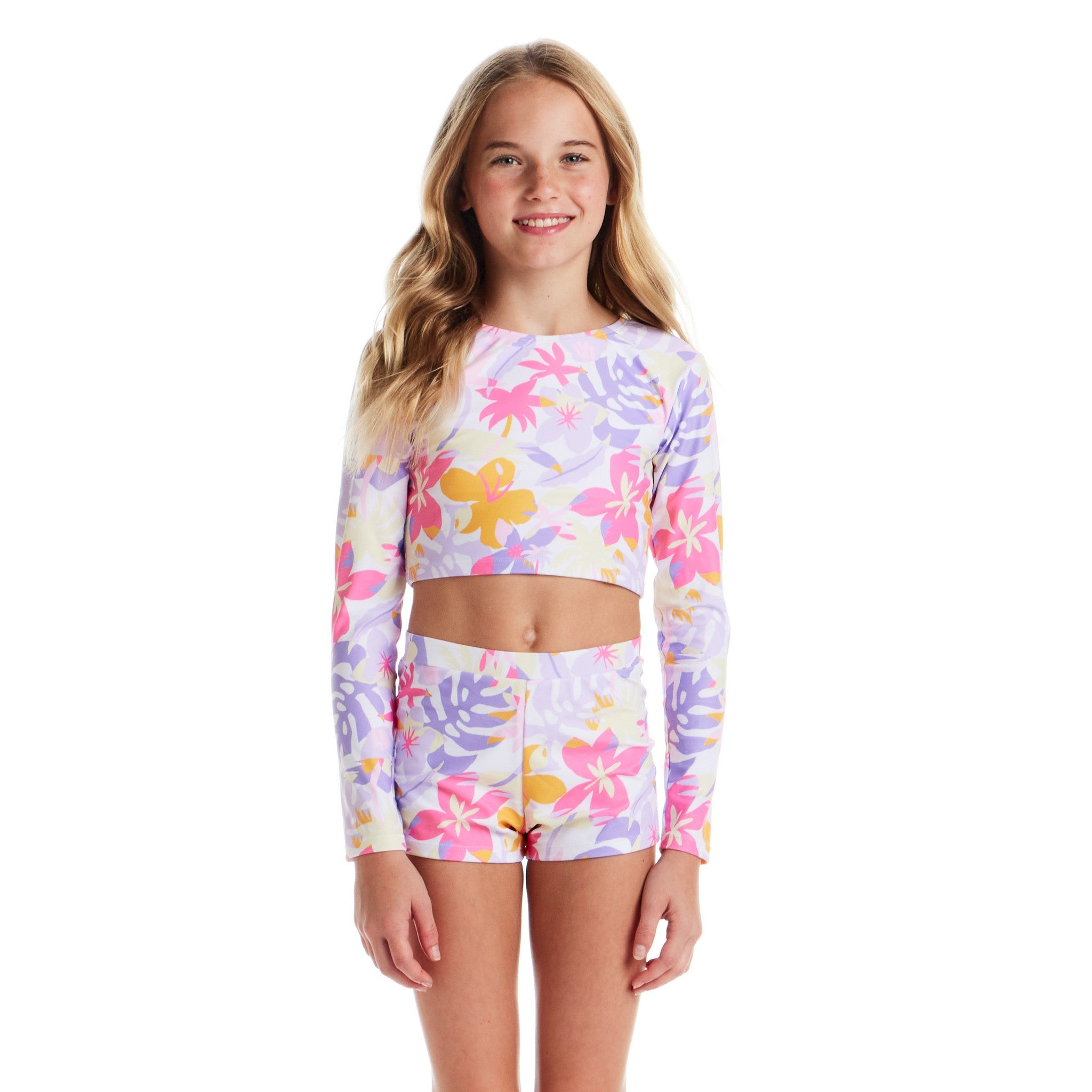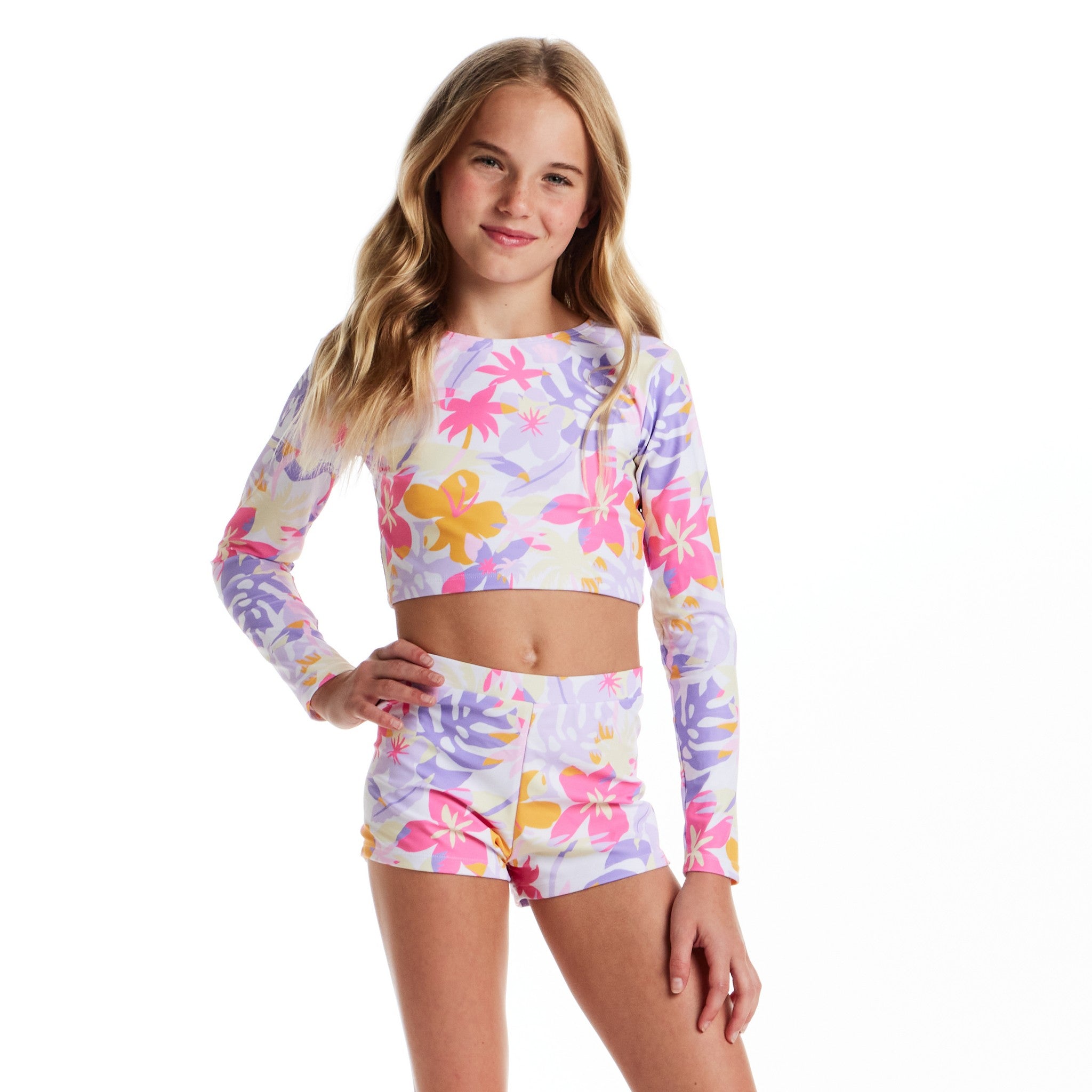 Bring all the sunshine vibes to her next pool day with this bright and breezy Palm Print Rashguard Set! With a fun tropical print and a sporty long-sleeve crop top paired with comfy matching shorts, she’ll feel stylish, confident, and totally ready for every splash, swim, and sandy adventure.