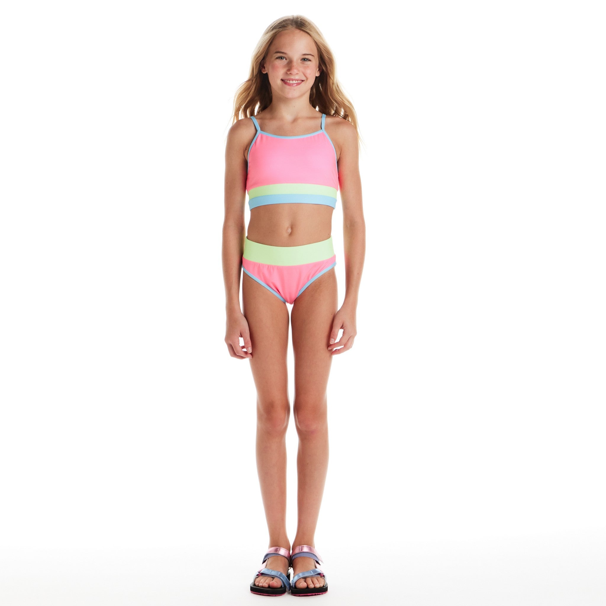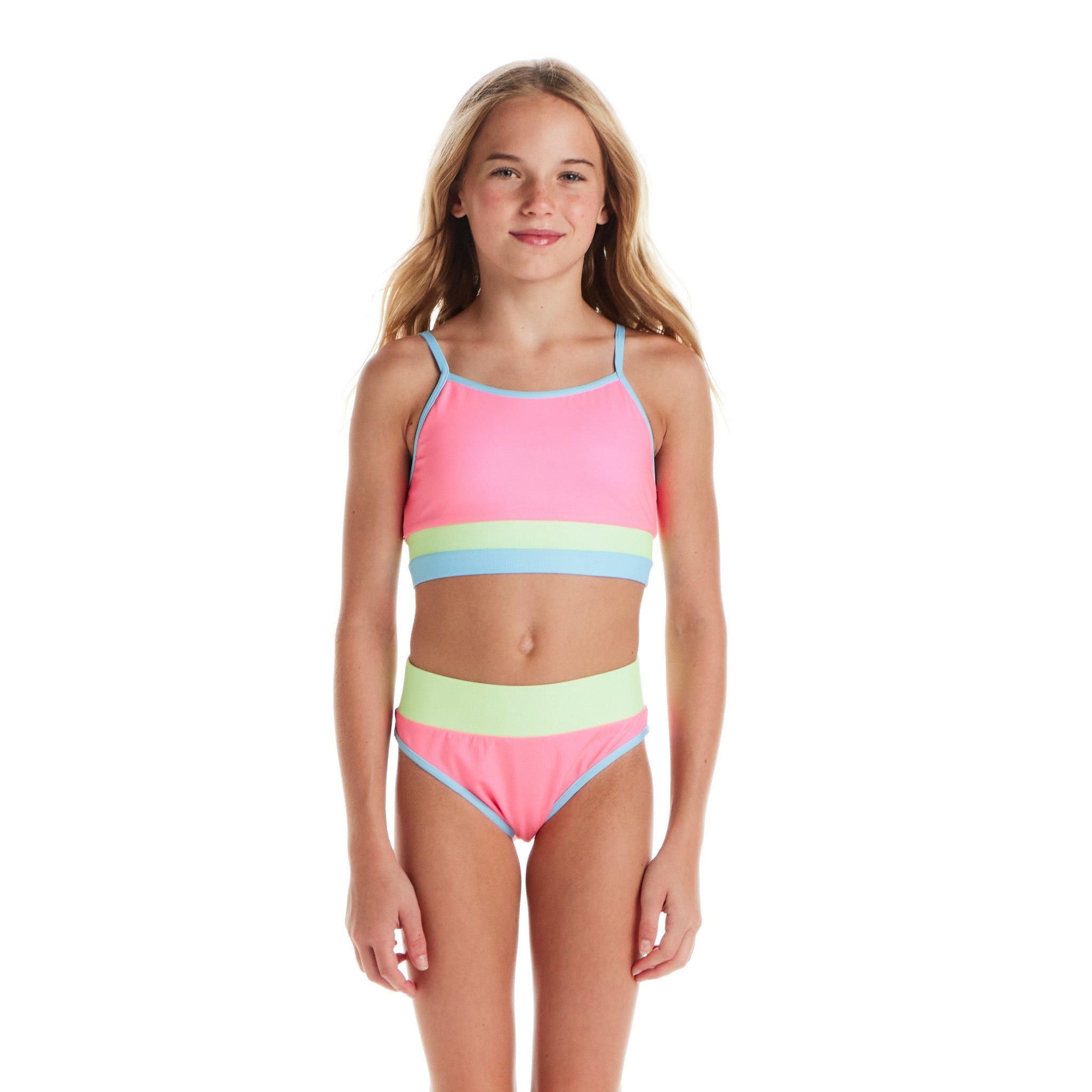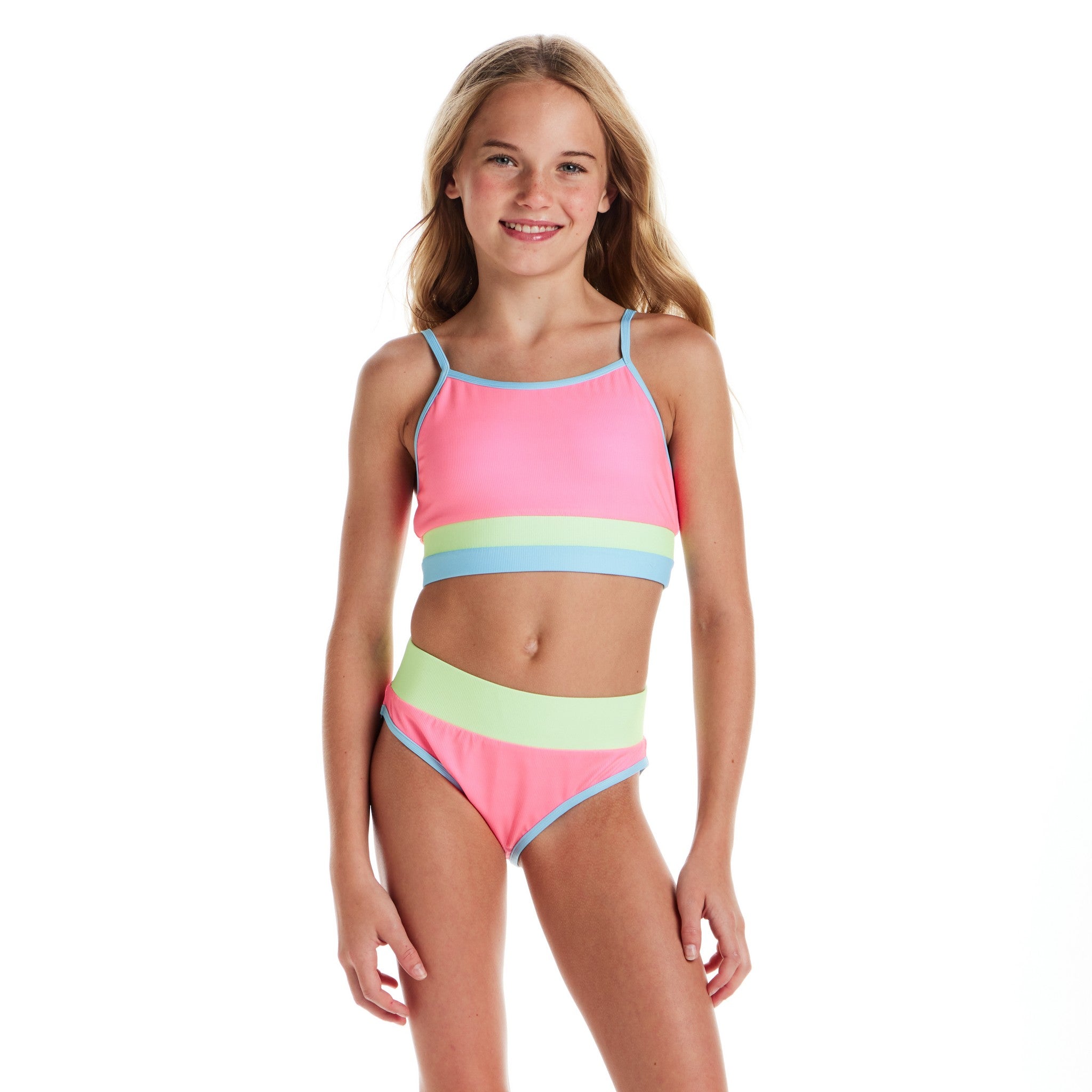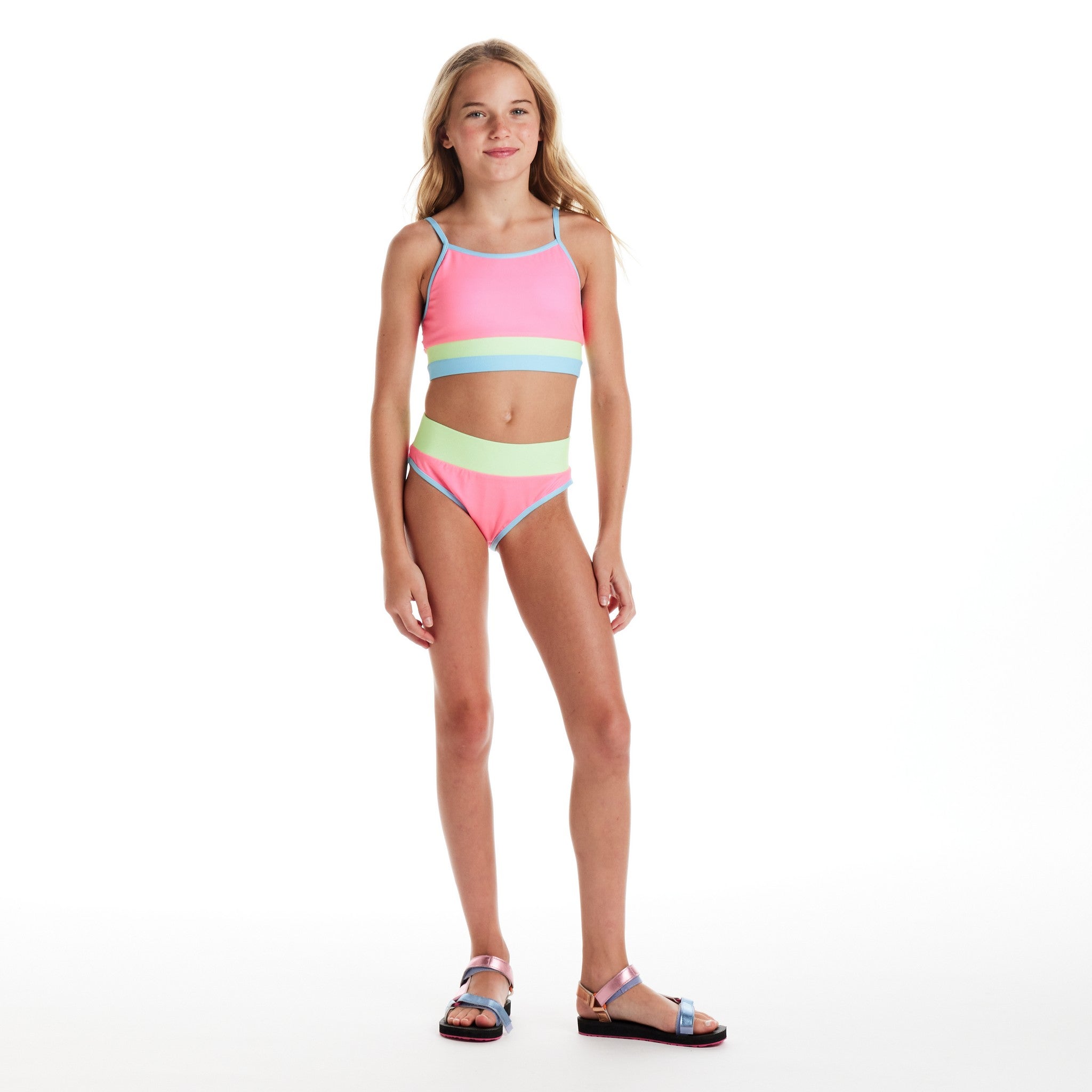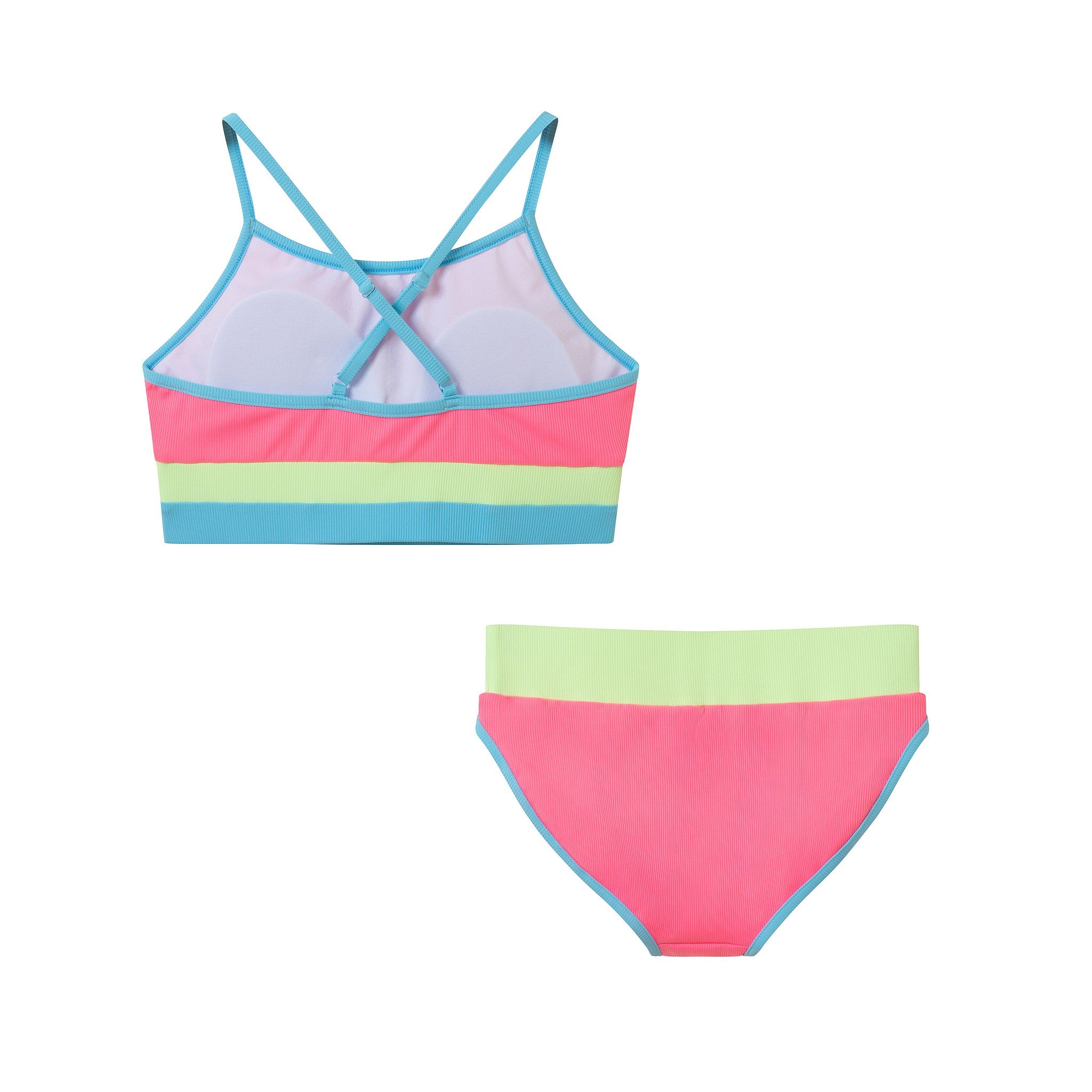 Bright, bold, and totally beach-ready — this ribbed colorblock bikini is made for tweens who love making a splash in vibrant style. With sporty vibes, soft rib texture, and fun pops of pink, aqua, and peach, this set keeps her comfortable, confident, and ready for every sunny adventure.