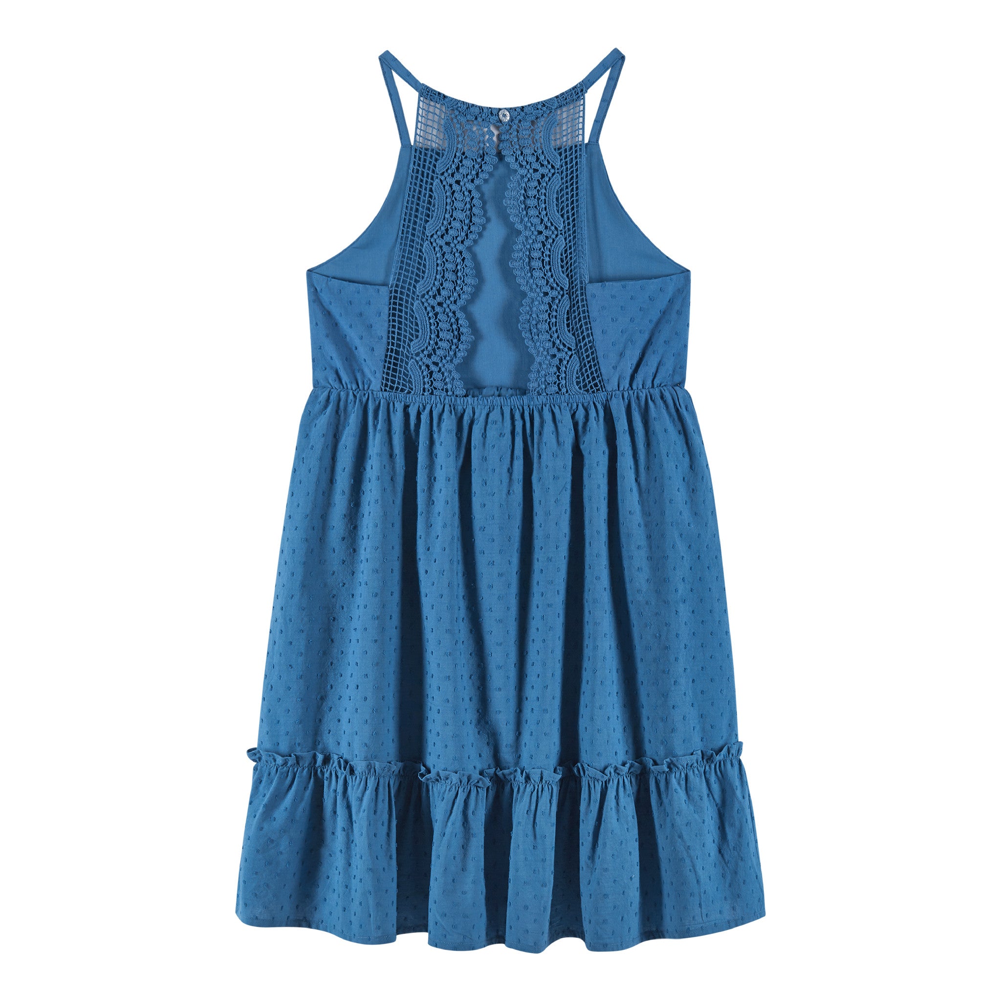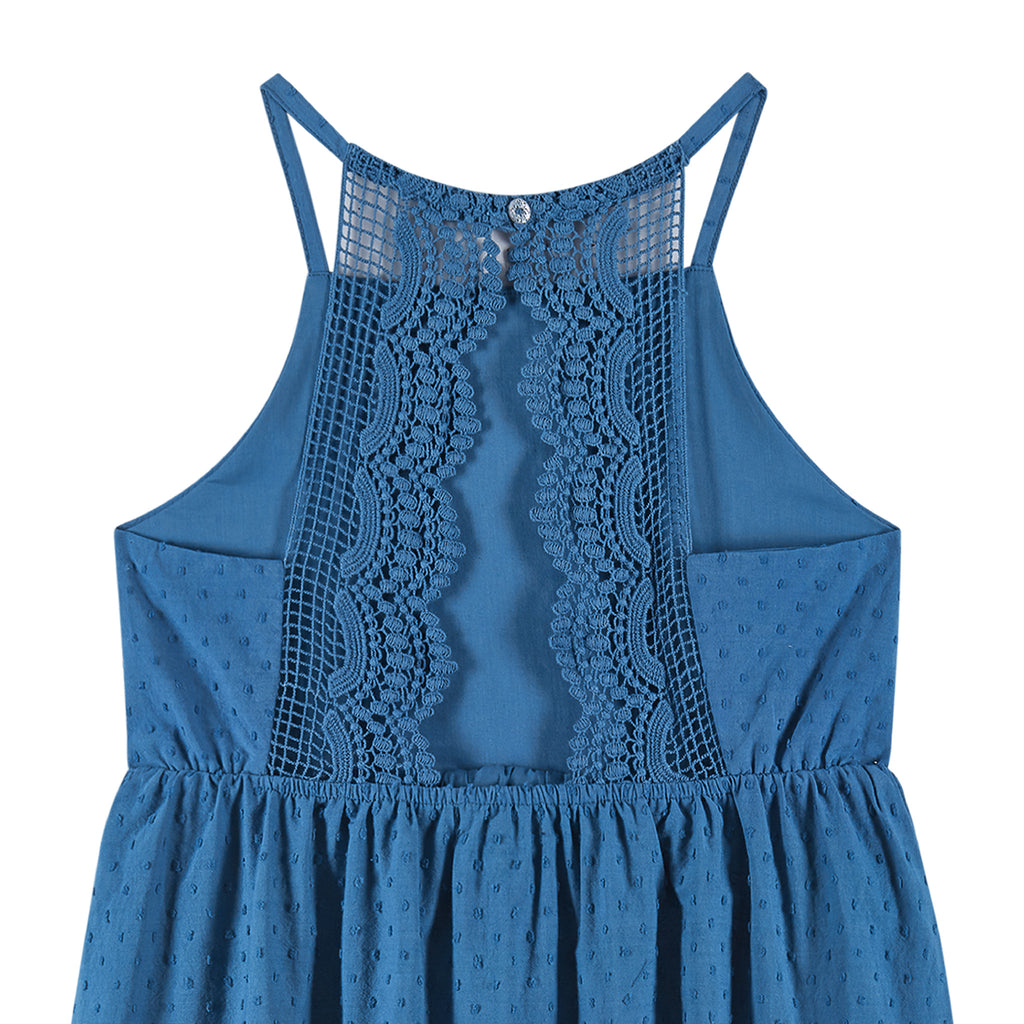 Kids (7-14) Blue Swiss Dot Dress w/ Lace Back Detail | Blue