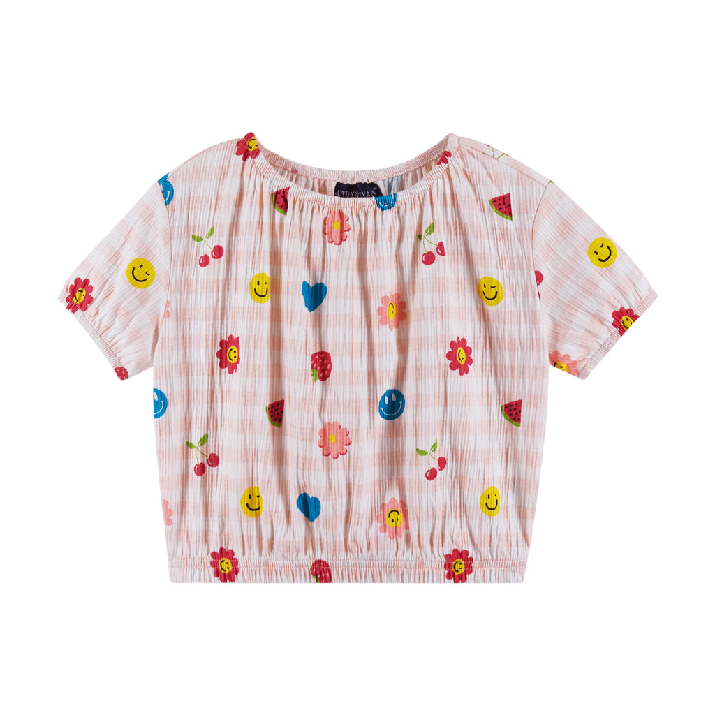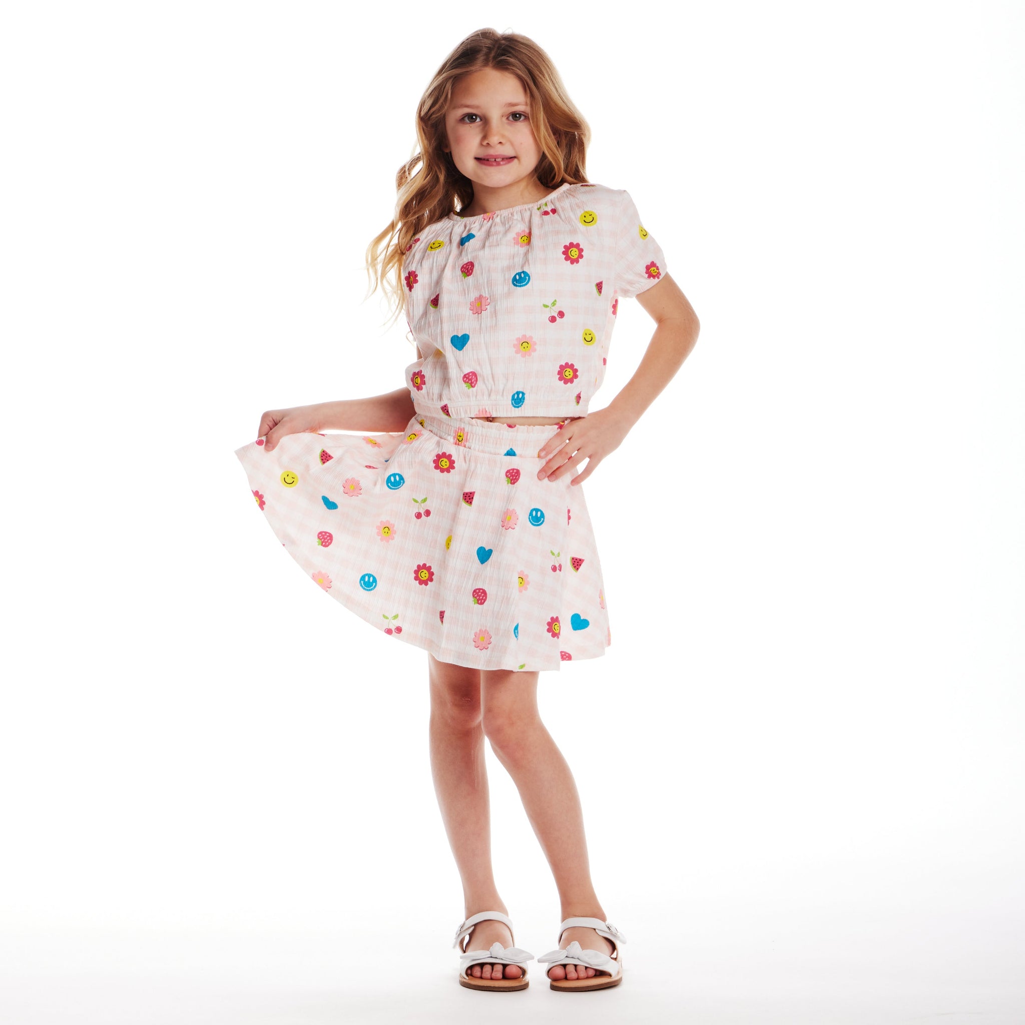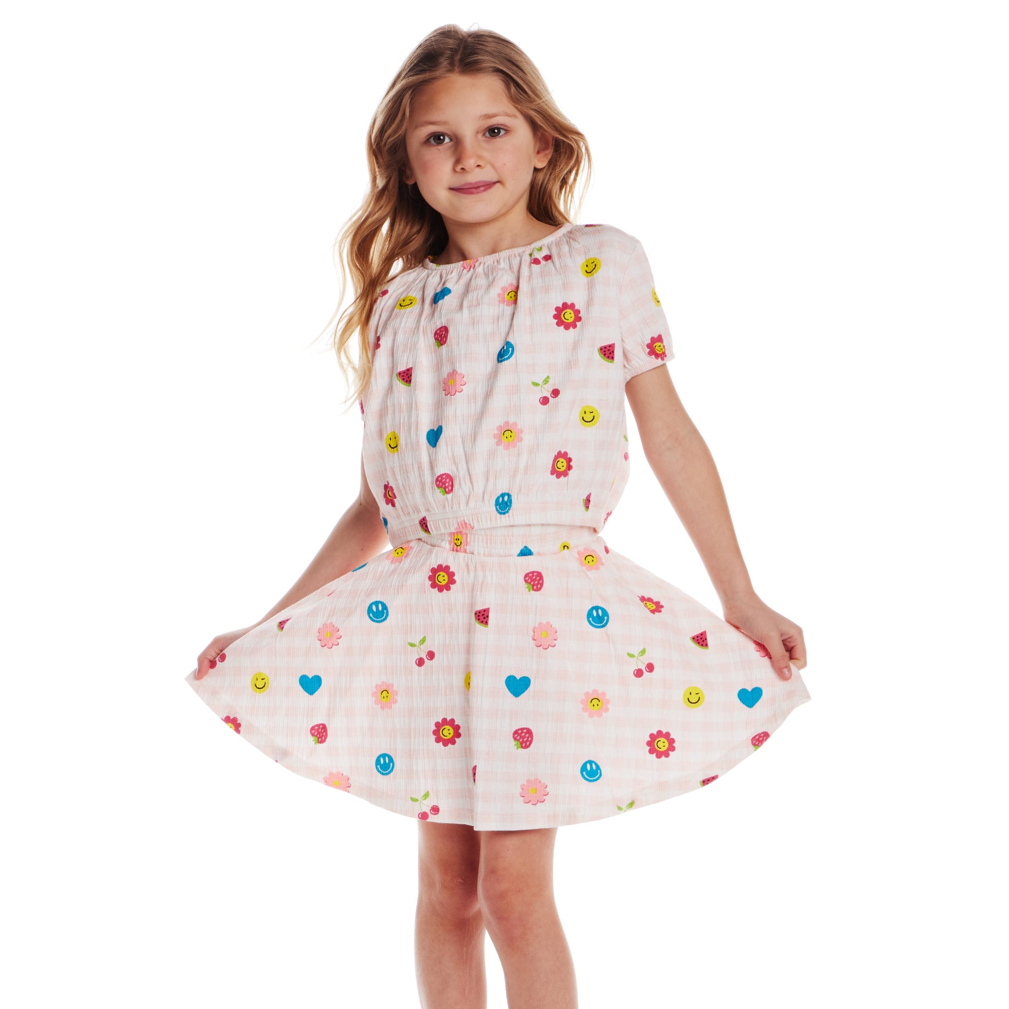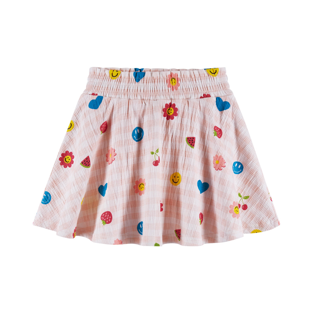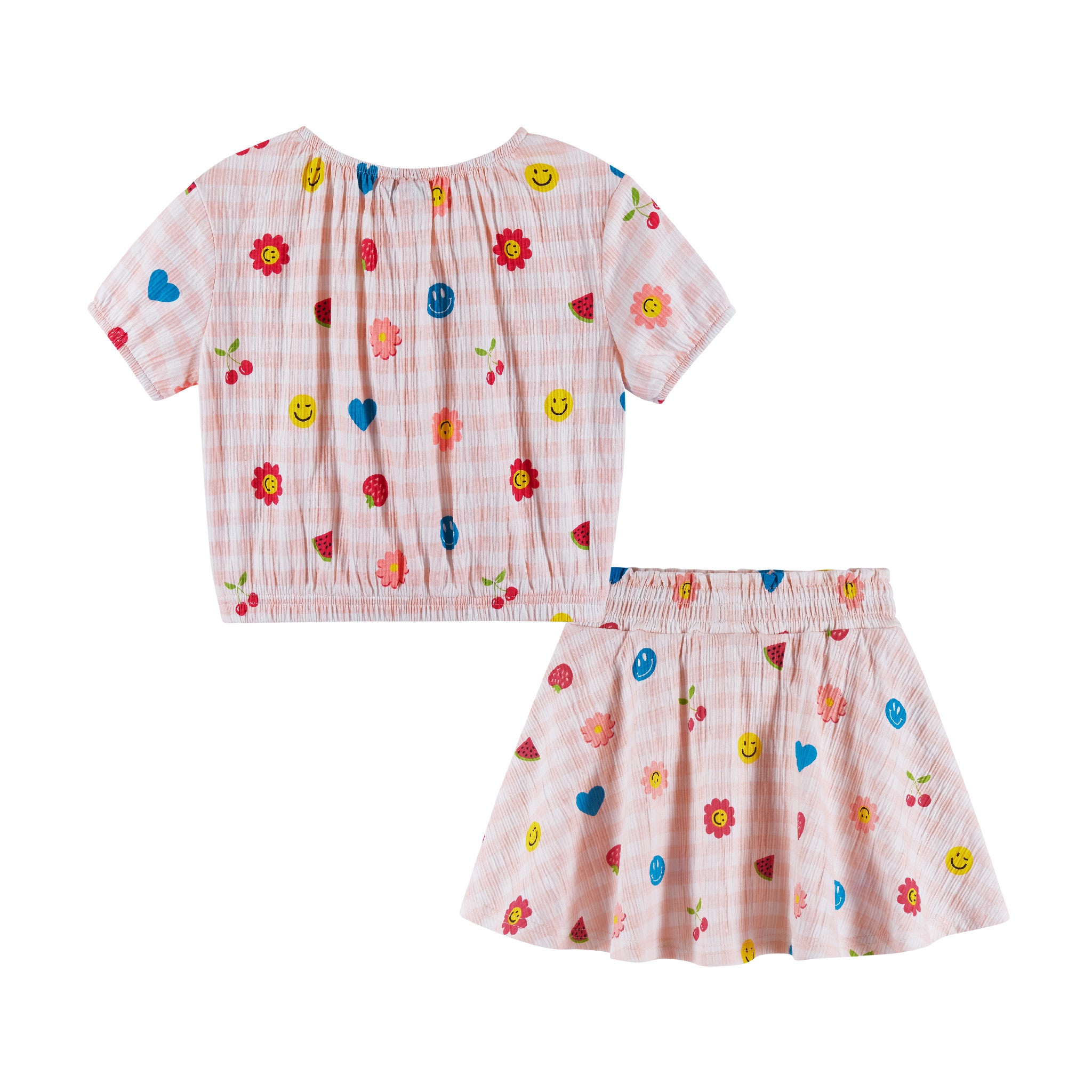 Brighten up your little one's day with this cheerful two-piece set! Featuring playful prints on a soft gingham background, this matching top and skirt set is perfect for sunny adventures and everyday fun. Easy to wear and irresistibly cute!