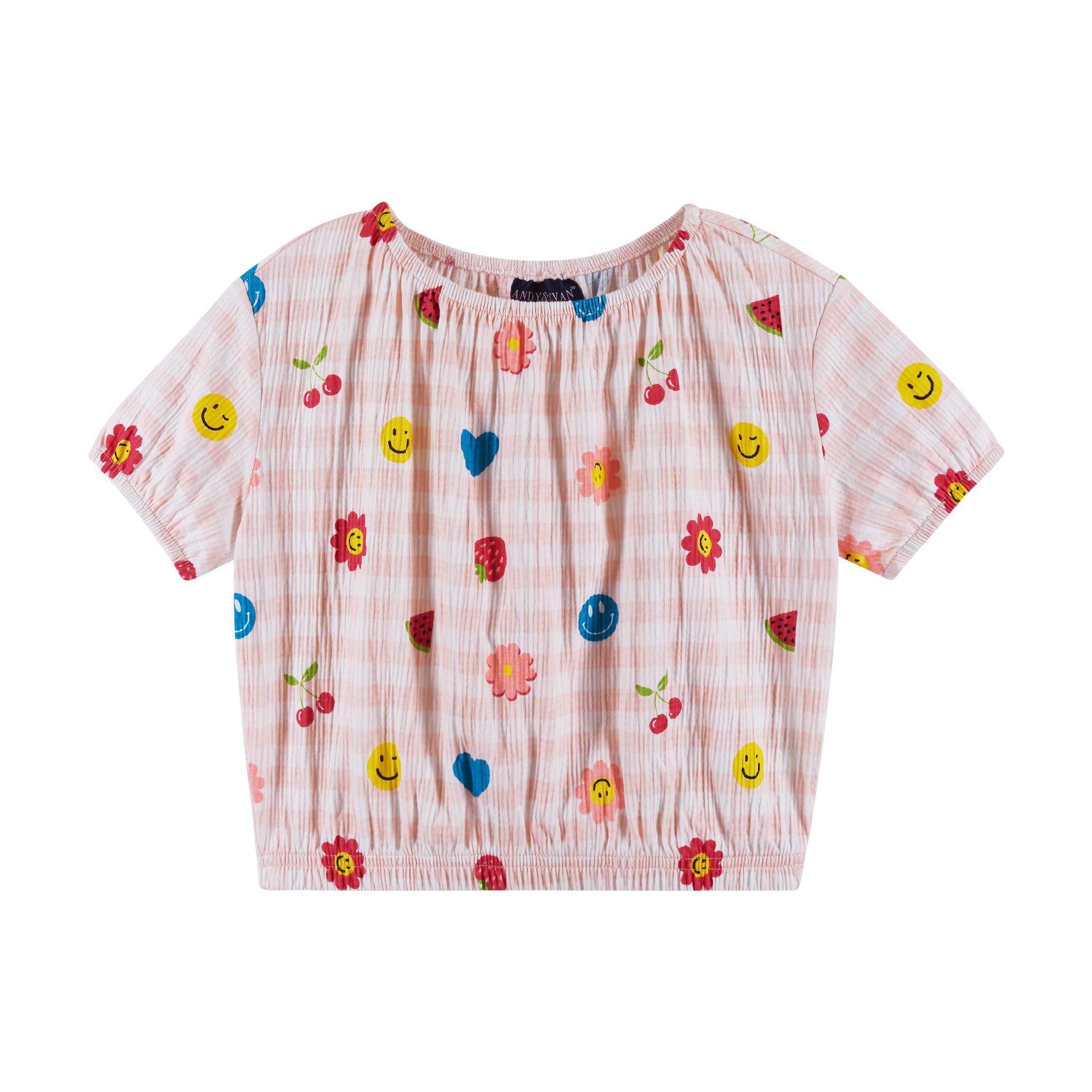 - Fun & Playful Prints: Adorned with colorful smiley faces, flowers, and fruit motifs on a pastel gingham base.