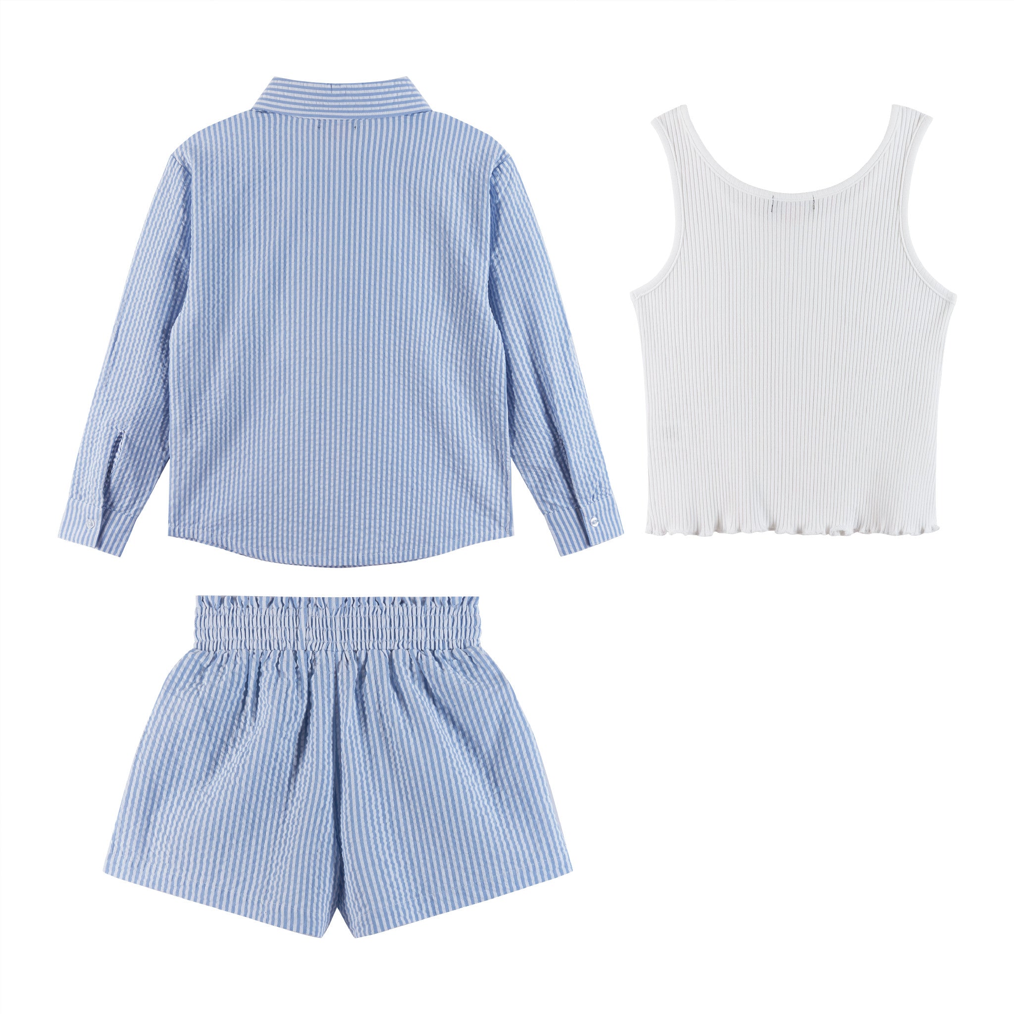 Effortlessly chic and versatile, this 3-piece set is perfect for your little one's casual and dressy occasions alike! Featuring striped button-down, matching shorts, and a ribbed tank, this set combines comfort with timeless style.