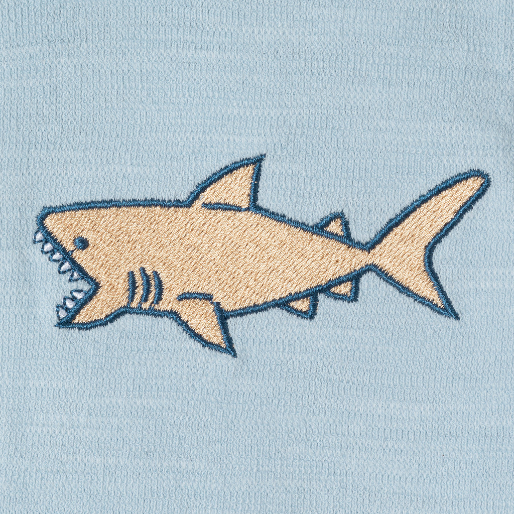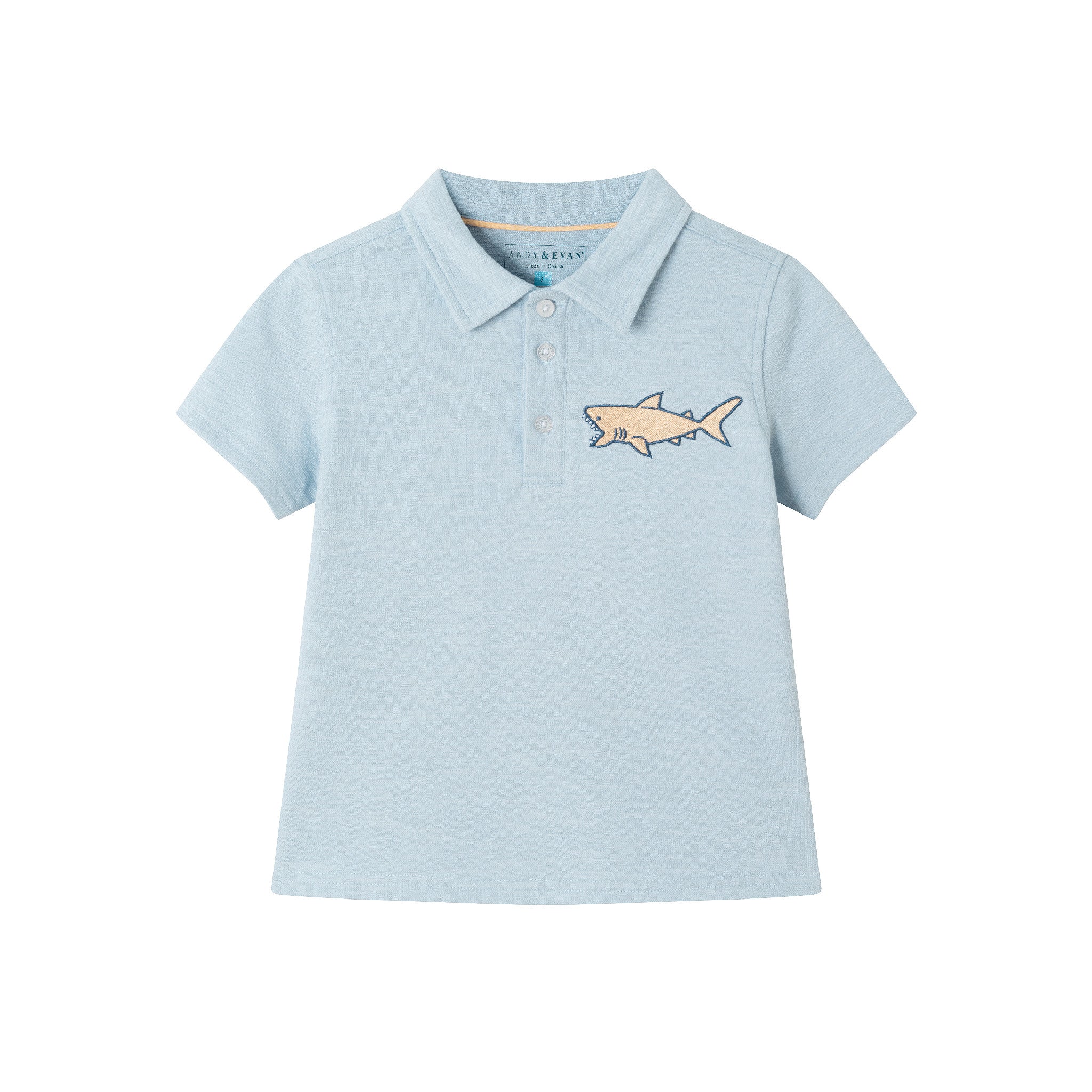 - Fun & Stylish Design: Features a light blue polo with an embroidered shark patch, adding a touch of ocean-inspired charm.