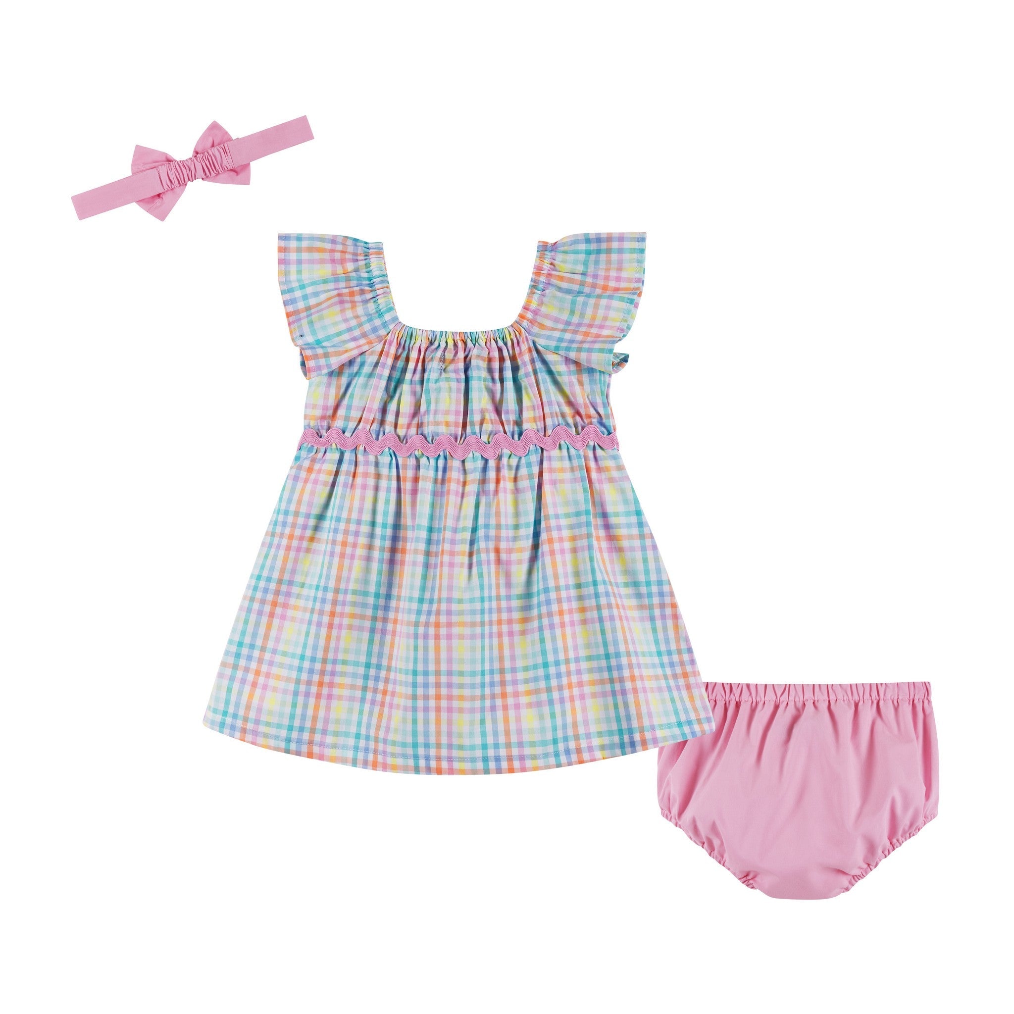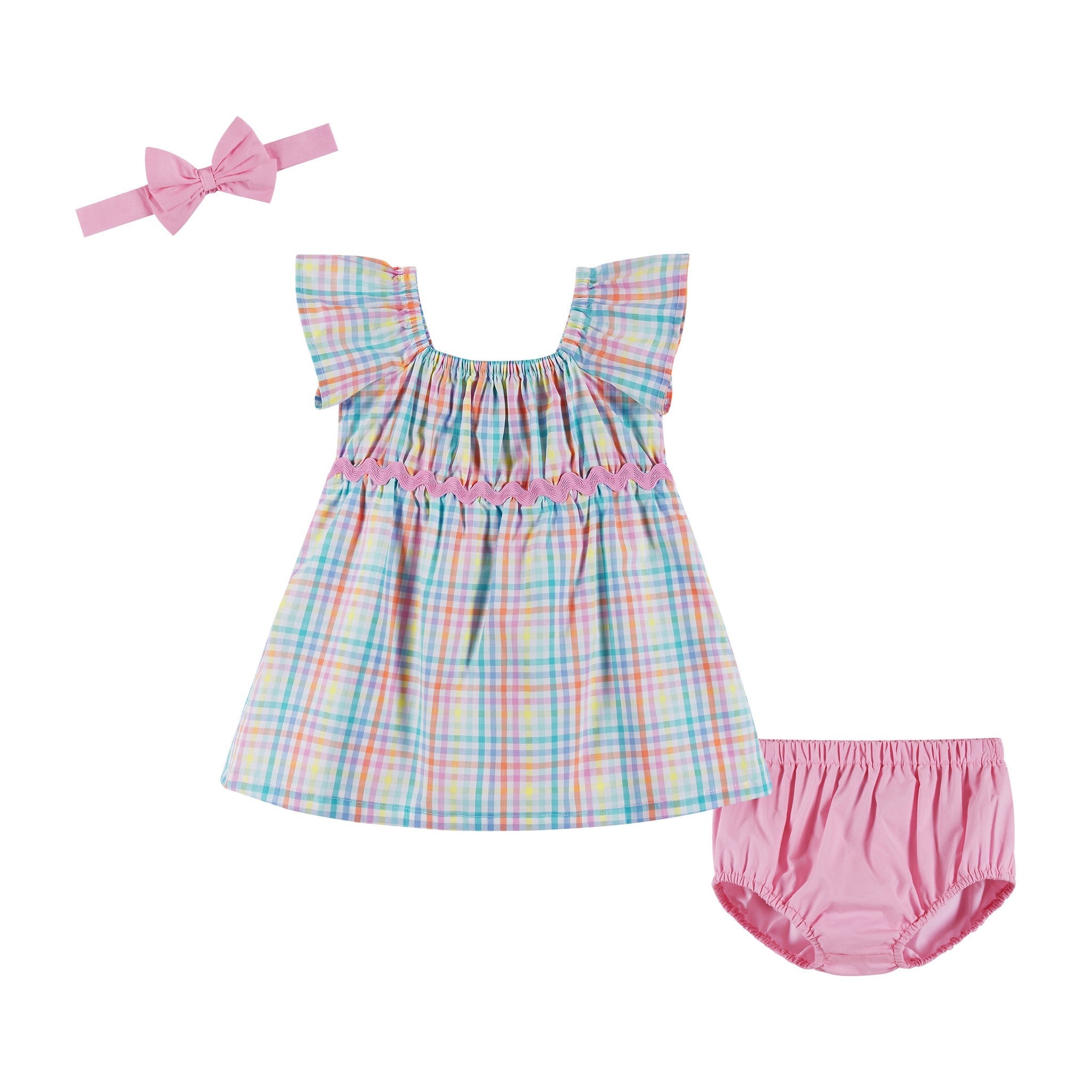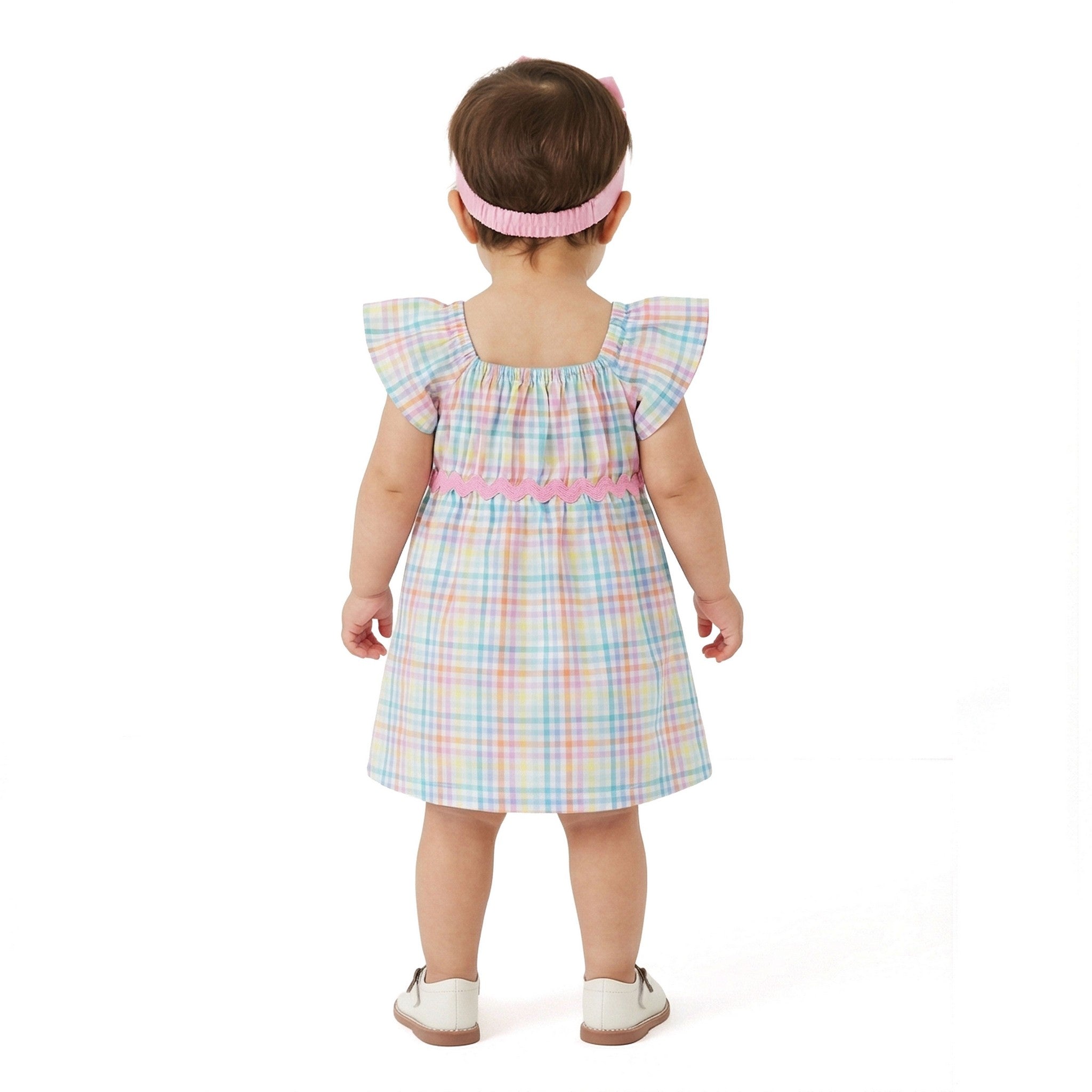 Start her day with a burst of color in this sweet and sunny plaid dress! Featuring a cheerful pastel pattern and a matching diaper cover, this set is a great choice for family brunch or outdoor play. It is a light and airy outfit that keeps her feeling cozy and looking adorable from her morning nap to her afternoon stroll.